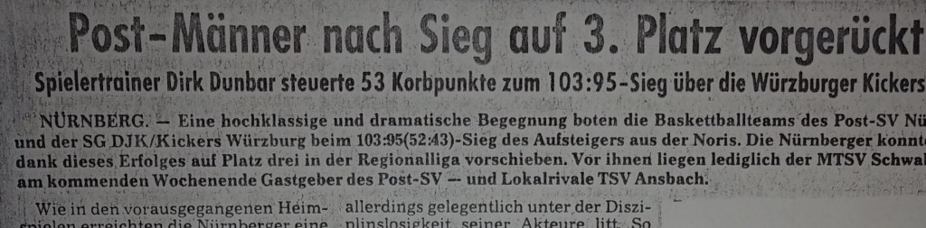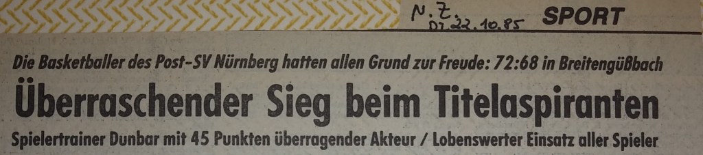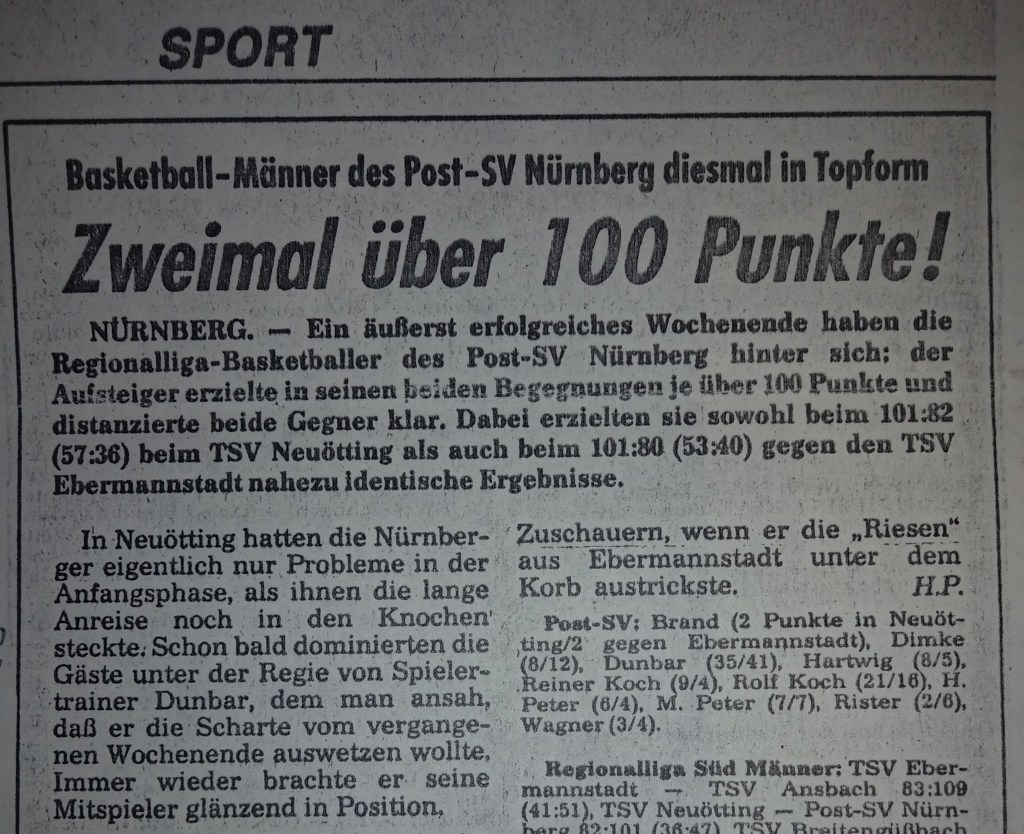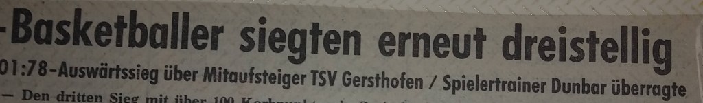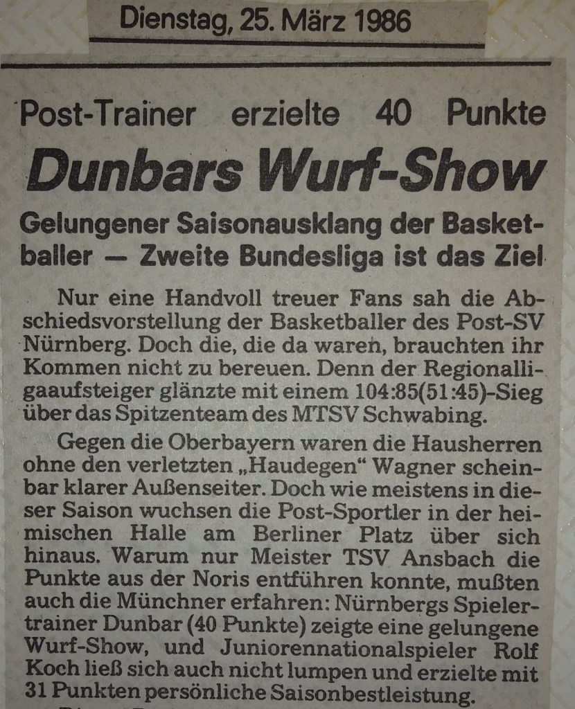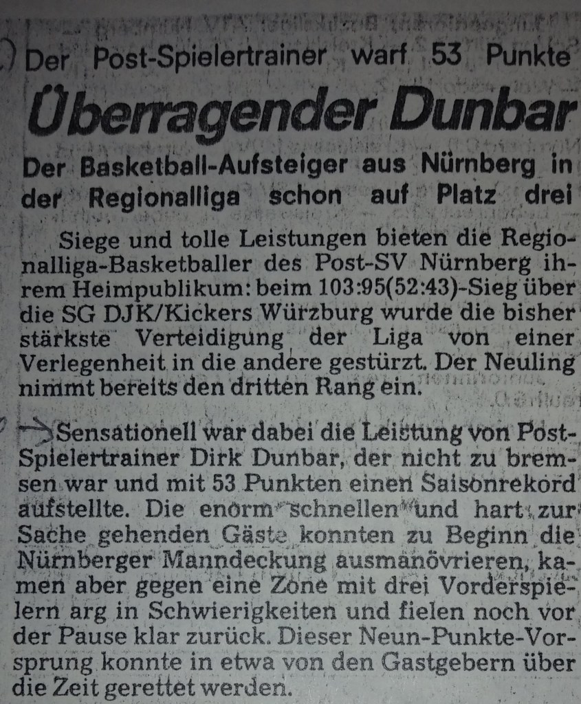 We had a great preseason, both on and off the court, but when Augsburg nailed us by 16 in the first game, writers welcomed us to the real world. I pointed out that the refs took away five baskets on three-second calls and said it would be a different story next time. I didn’t mention that I should have had ten more free throws. Instead, I ended up with two tic-tac technical fouls and was kicked out in the second half after scoring 35. Everyone knew, especially my teammates, that we would never go down without a fight. “Dunbar Shoots down Breitengussbach” was the Bayern headlines after I scored 43 in the next game, which we won by four. I had three of my six steals in the game’s last minute! We lost the next game by 3 but then won back-to-back games the next weekend, in which I scored 43 and 45. The headlines of a South-German press release covering all Regionalliga games stated, “The Dunbar-Express Rolls” (a nickname that stuck). I scored 45 again in the next game, a big road win, and the Nurnberger News headlines suggested that I “Played the Tall Guys Dizzy,” and the first sentence said I left our fans screaming and the hometown fans shaking their heads. We beat Gersthofen (the other team that advanced into our league) by 25 the next game and I had 42 despite sitting most of the second half.