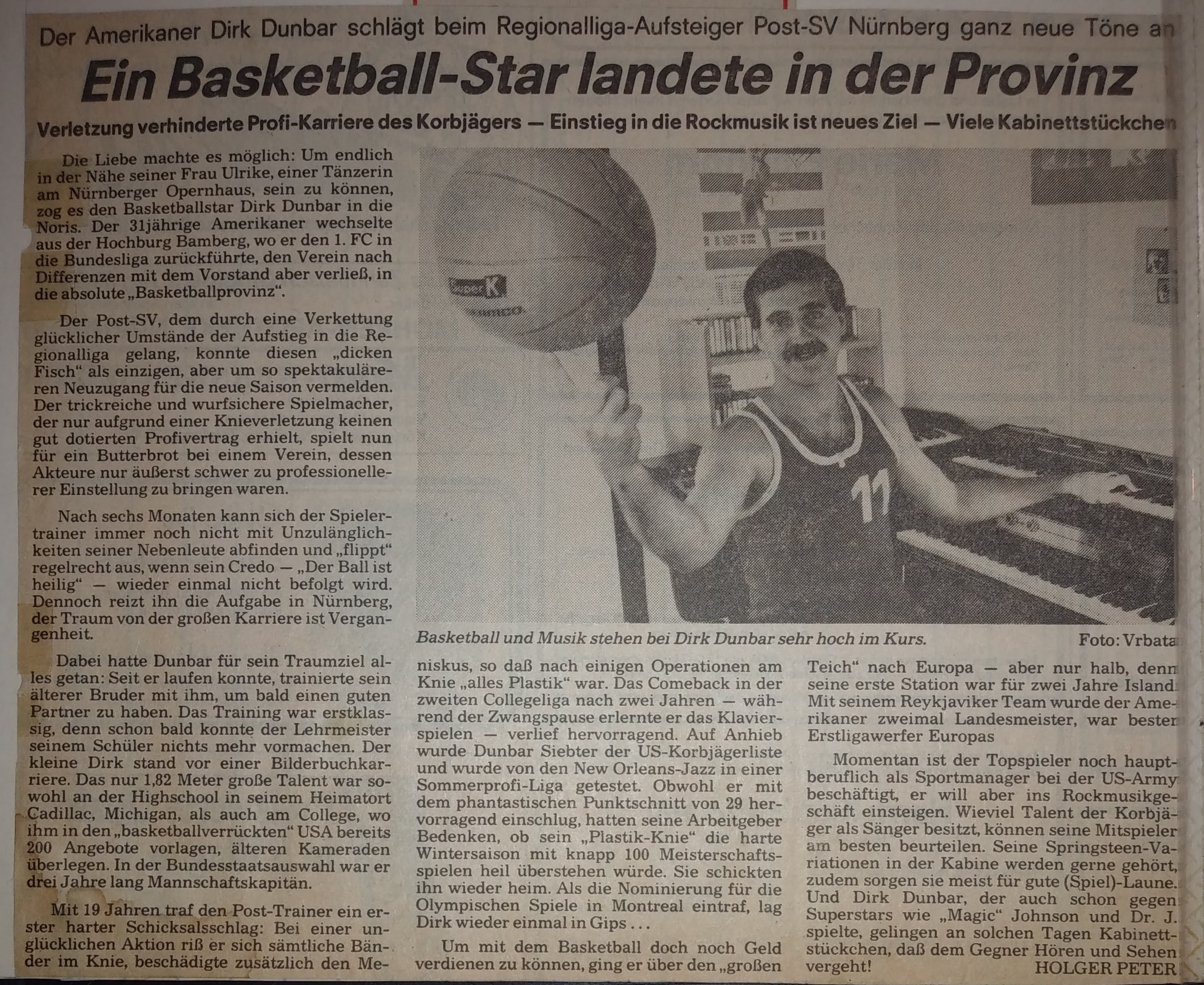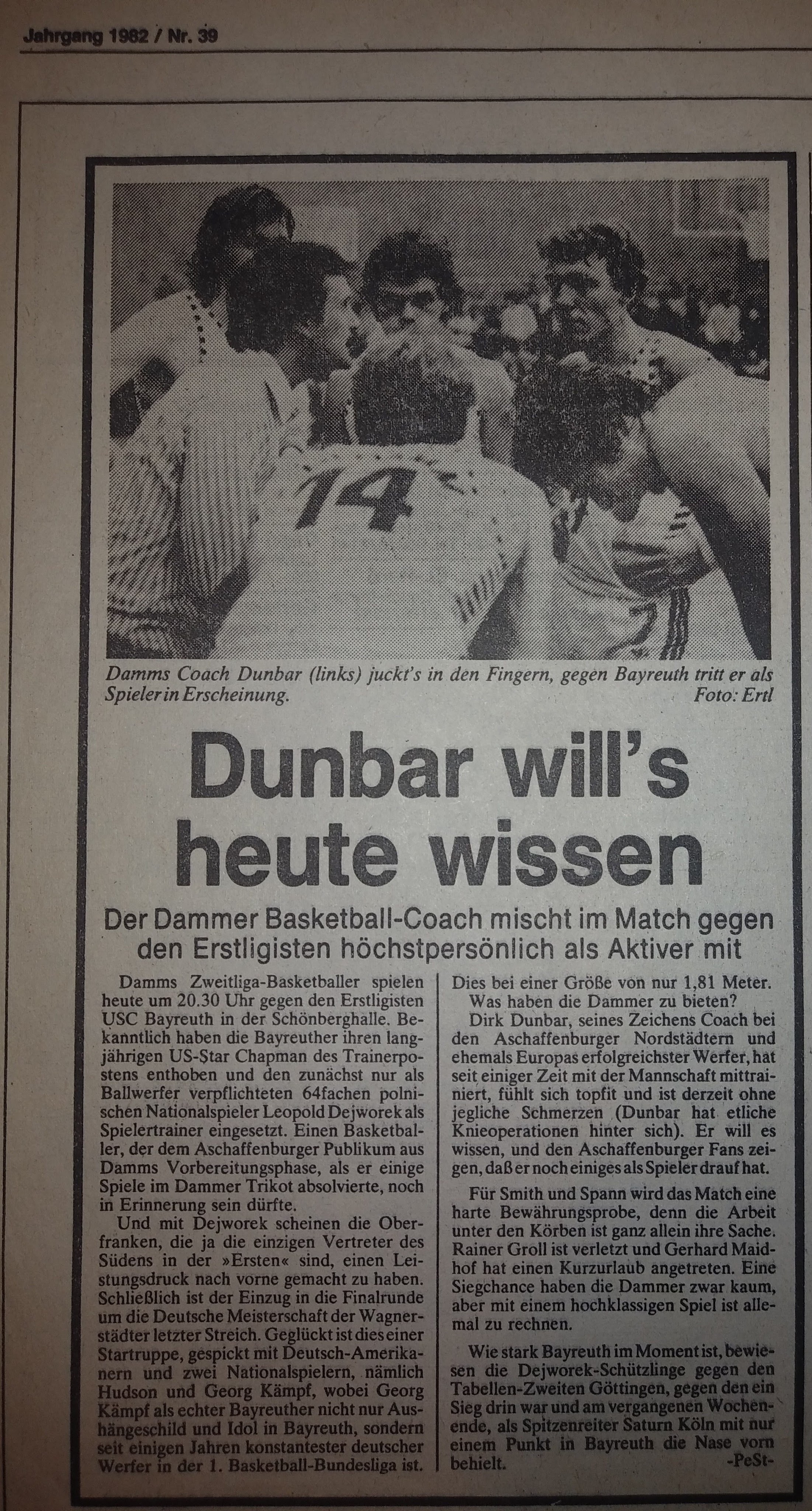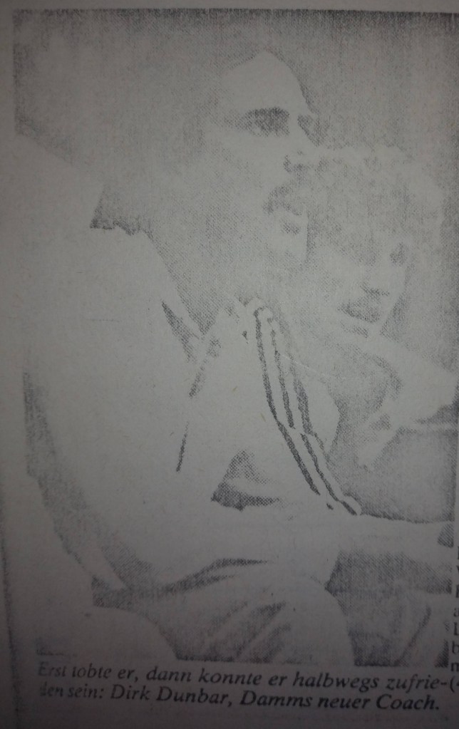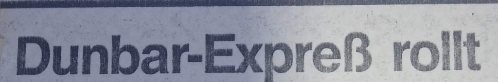 We had a great preseason, both on and off the court, but when Augsburg nailed us by 16 in the first game, writers welcomed us to the real world. I pointed out that the refs took away five baskets on three-second calls and said it would be a different story next time. I didn’t mention that I should have had ten more free throws. Instead, I ended up with two tic-tac technical fouls and was kicked out in the second half after scoring 35. Everyone knew, especially my teammates, that we would never go down without a fight. “Dunbar Shoots down Breitengussbach” was the Bayern headlines after I scored 43 in the next game, which we won by four. I had three of my six steals in the game’s last minute! We lost the next game by 3 but then won back-to-back games the next weekend, in which I scored 43 and 45. The headlines of a South-German press release covering all Regionalliga games stated, “The Dunbar-Express Rolls” (a nickname that stuck). I scored 45 again in the next game, a big road win, and the Nurnberger News headlines suggested that I “Played the Tall Guys Dizzy,” and the first sentence said I left our fans screaming and the hometown fans shaking their heads. We beat Gersthofen (the other team that advanced into our league) by 25 the next game and I had 42 despite sitting most of the second half.