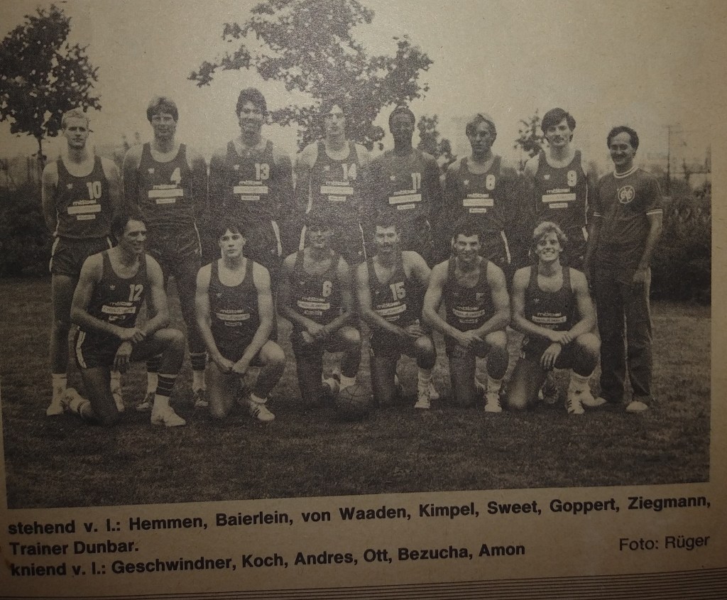 I coached Ober-Ramstadt’s Regionalliga team (Germany’s third-highest league at the time), taught basketball at Darmstadt University, and studied German during my first year in Germany. I did play in a few Cup games, some of our club’s Bezirksliga games, and a couple of tournaments (including one in France), but I was paid to coach. We were not considered contenders but didn’t care: our goal was to get to the second league. Most players were in their early twenties. We picked up a 6’6” post player, Hansel Banks, who worked at a local U.S. army base. He could leap, score, block shots, and rebound against anybody. Gunter Ackermann was our small forward and second-leading scorer. He could drive, finish, and had a nice jump shot. His brother Volker, who taught me more German than anyone on the team, got some minutes but played mostly with the Bezirksliga team. Our two-guard, Matthias, was one of our best players. He had a great shot, a high basketball IQ, rarely turned the ball over, and was the silent team leader. Rainer or “Joker” played point and ran the offense while Klaus played power forward and did all the dirty work, such as setting picks, rebounding, and guarding the opposing team’s leading scorer. Michael and Werner came off the bench and gave us a lift.
