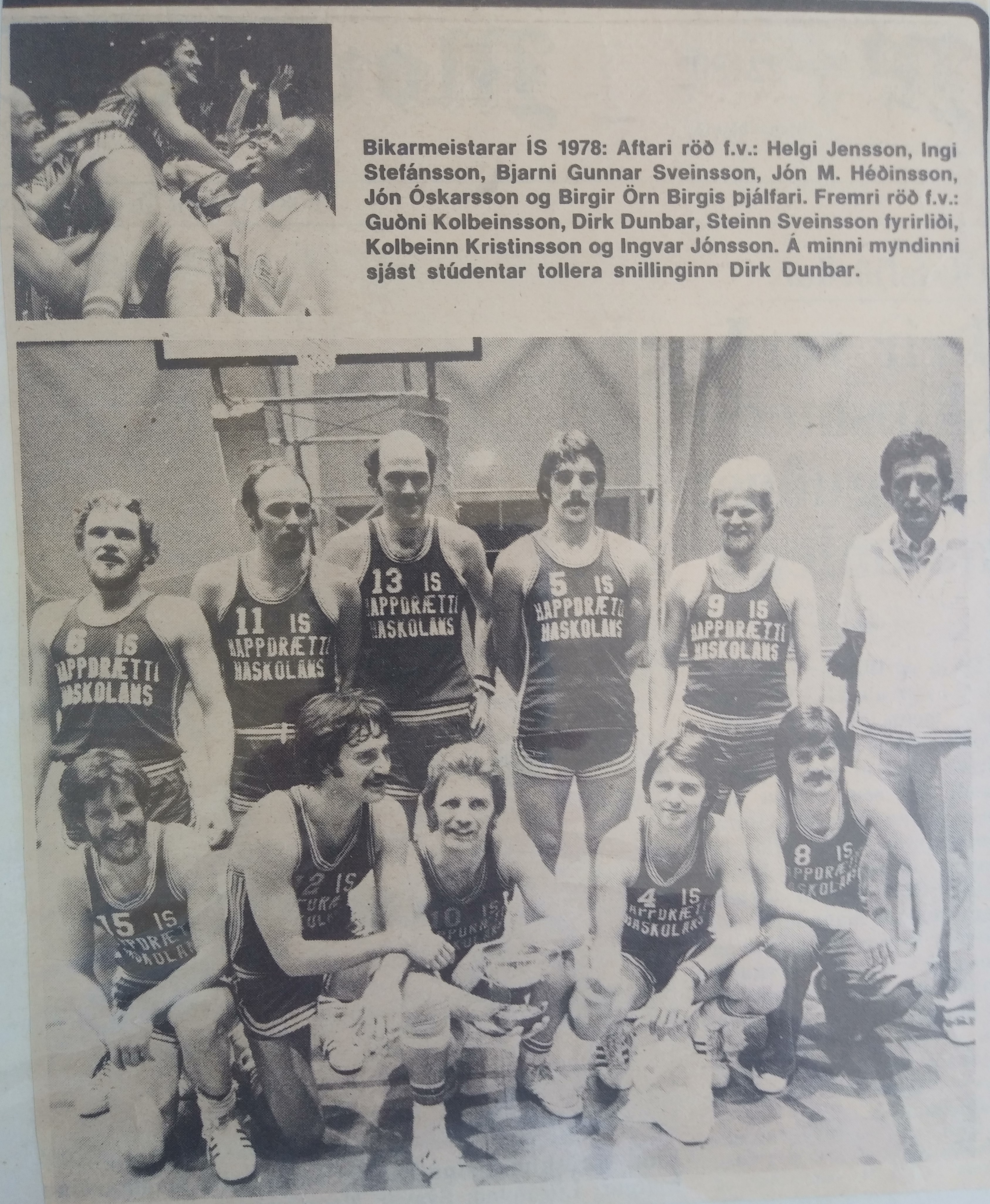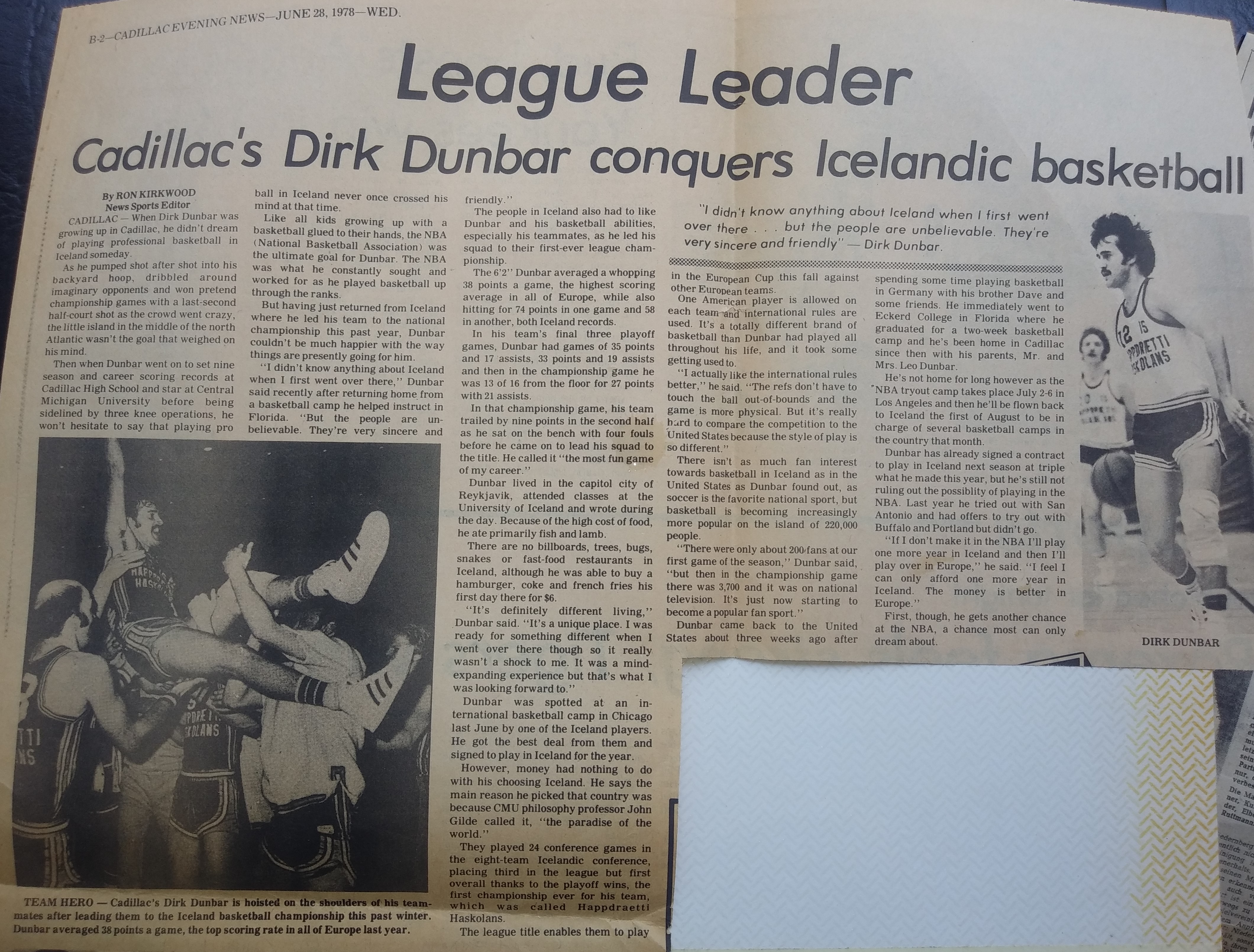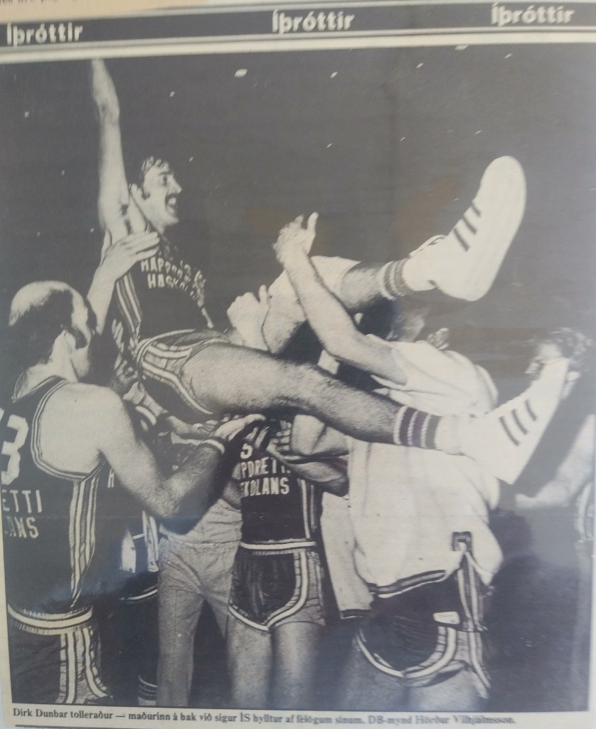 After an eighteen and six regular-season record, we went into the eight-team playoffs as the third seed and pulled out two tight wins in which I scored 33 and 35 points. In the championship game against Valur, I was double-teamed and the defense collapsed on me every time I drove. I only took 16 shots (the least in any game I played in Iceland), but made 12 of them and ended up with 27 points, but more importantly, had a career-high 22 assists. An editor of Dagbladid gave me a translated article of the game, which began by describing “the duel” between Rick and me, and quickly added, “But it was Dunbar who could not miss, no matter where he was on the court. His technical prowess with the ball, weaving his way through the defense to score or, even more often, dropping off spectacular passes to teammates he helped get open. The crowd [the biggest in Icelandic basketball history] enjoyed it tremendously.” After specifying why I “won the duel and IS won the cup,” the writer describes how each time Valur took the lead I would hit a couple baskets to regain the lead, and that after getting my fourth foul and having to sit, our team “fell to pieces” and Valur took a six-point lead late in the fourth quarter. Then I got back in and “just like that” made six points, two steals, two assists, and assured the four-point win. It was the first championship ever for Happdraetti Hauskolans, and the Old Guys sure knew how to celebrate.