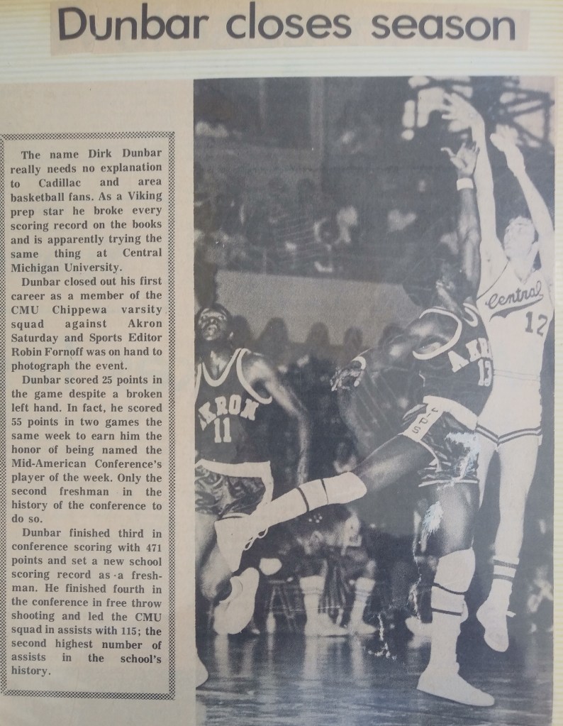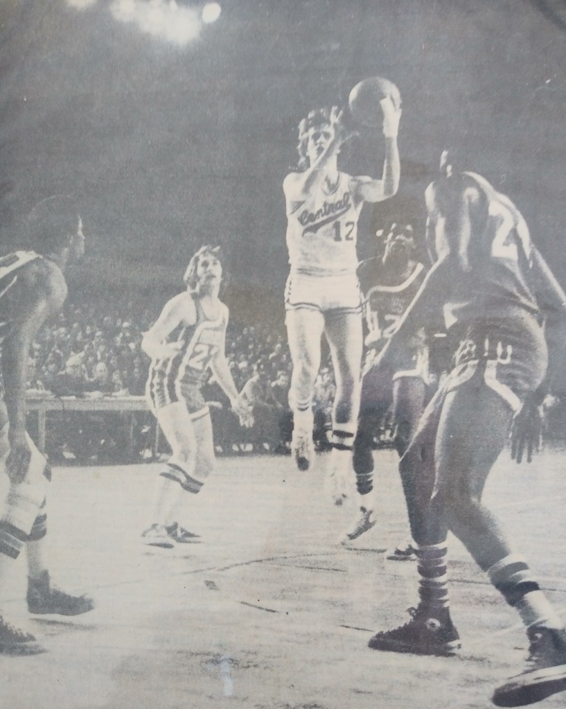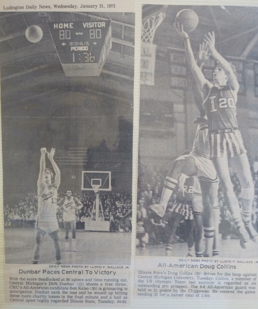 Choosing a college was not easy. I had over two hundred scholarship offers. My coach, mentor, and friend, Don Johnson, screened them for me, especially the phone calls and visits. School administrators roped off a small section before games just for scouts. I got to know some of them and had several head coaches in our living room. The recruiting trips were nice but I had my heart set on Michigan State (though South Florida also looked good). Then, shortly after watching the team in a summer scrimmage, I chose Central Michigan because they had Ben Kelso and Dan Roundfield, were going D1 and playing in the Mid-American Conference, building a new arena, and I liked Coach Parfitt and was pretty sure I could start as a freshman. 1972 was the first year freshmen were allowed to play varsity sports since 1962 and I made the most of it. I got mononucleosis and had to sit out most of the preseason but in the last game, I led in scoring, assists, and rebounds against the Chilean National Team.
