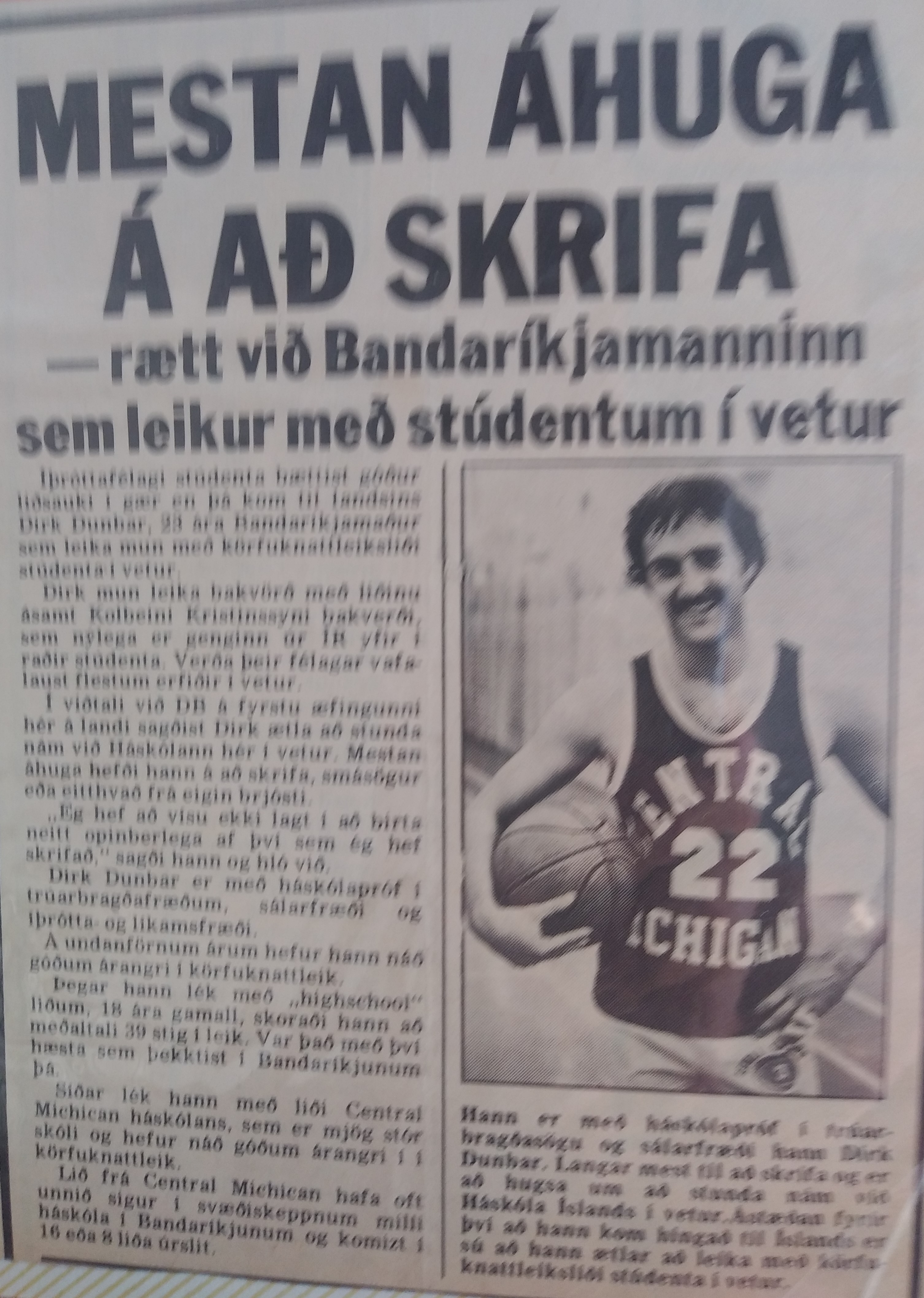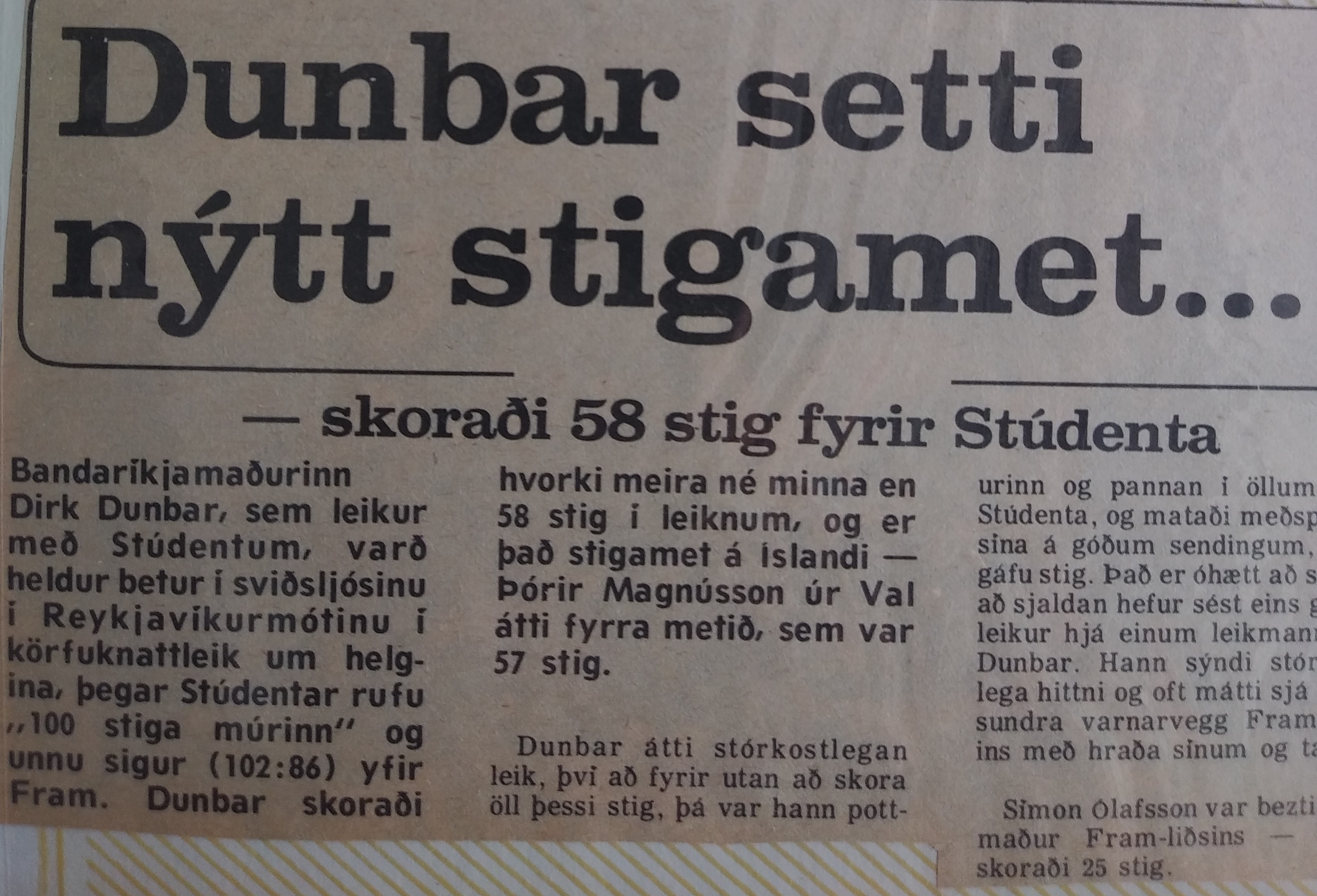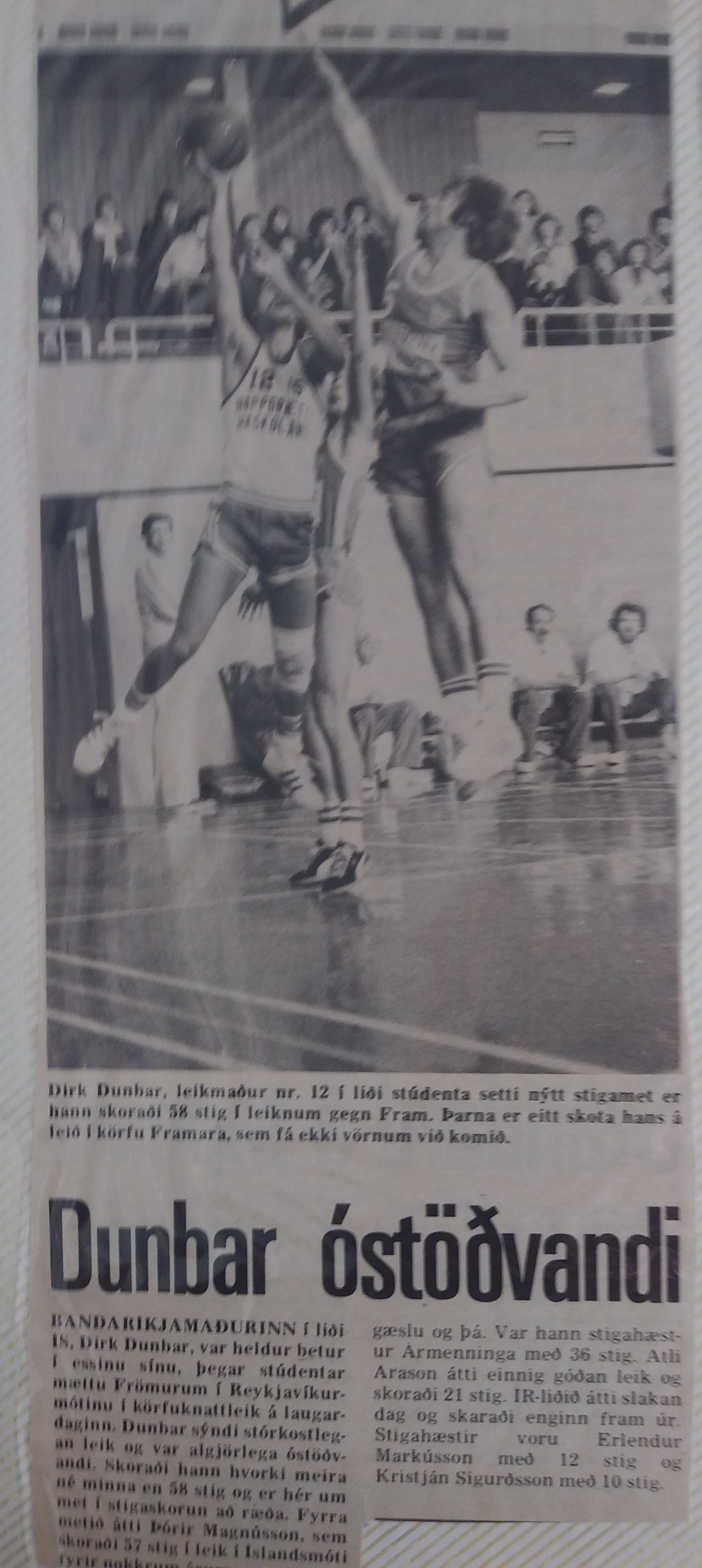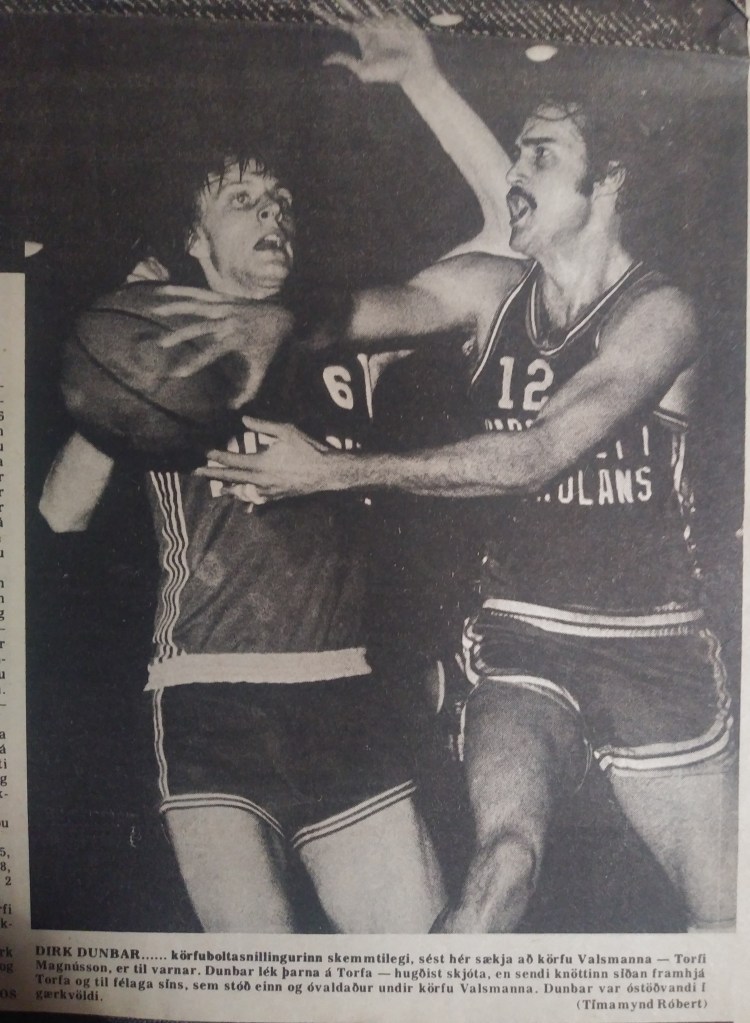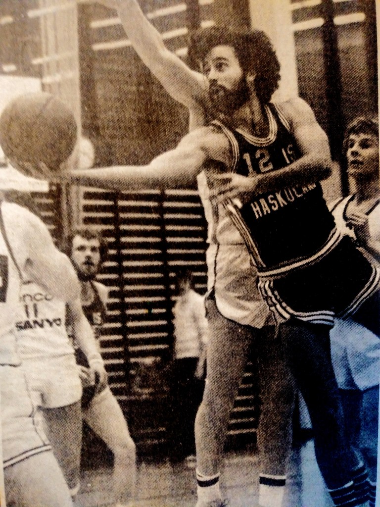 I was surprised by the warm welcome from the press as well as the instantaneous parties thrown by my teammates. It didn’t take long to get used to the European style of play. We beat Fram, the biggest team in the league, and I scored a record 58 points. Long jumpers, bankers, running one-handers, and even finger rolls–they all went in one of my best games ever. We lost our third game badly to Nyardvik, and I knew that we would have a lot of tough contests. We won our next five by 4, 5, 3, 1, and 2 points respectively; and I had 36, 35, 38, 42, and 37 points (yes, I have the articles). Unquestionably, I was playing the best basketball of my life. We lost the next game to KR, our biggest nemesis, by three, despite my 40 points and 10 assists. Then we lost to Valur, our second biggest rival, by 12 and fell into fourth place. Valur had a couple of excellent players, including my friend Rick Hockenos, a former St. Francis star who had a short stint with the Chicago Bulls. We hit Christmas break in fourth place but started the New Year in high fashion. We got revenge on Valur, beating them by 1 (I had 37) and then on KR (I had 45 and 8 assists). I’ll never forget the ever-quiet Kristen, the national team player and longtime center for KR, telling me after the game I had just played the best basketball game that anyone ever played in Iceland. I was humbled and flabbergasted. We might not have been the best team, but we were certainly fun to watch. Ours was the only team that was on every television broadcast.