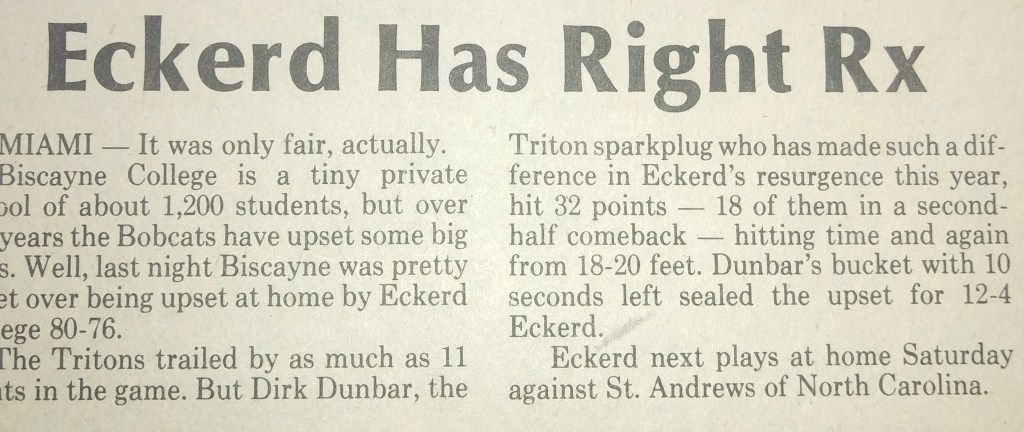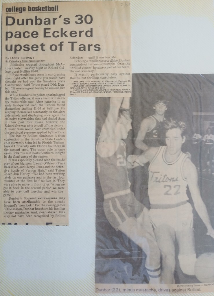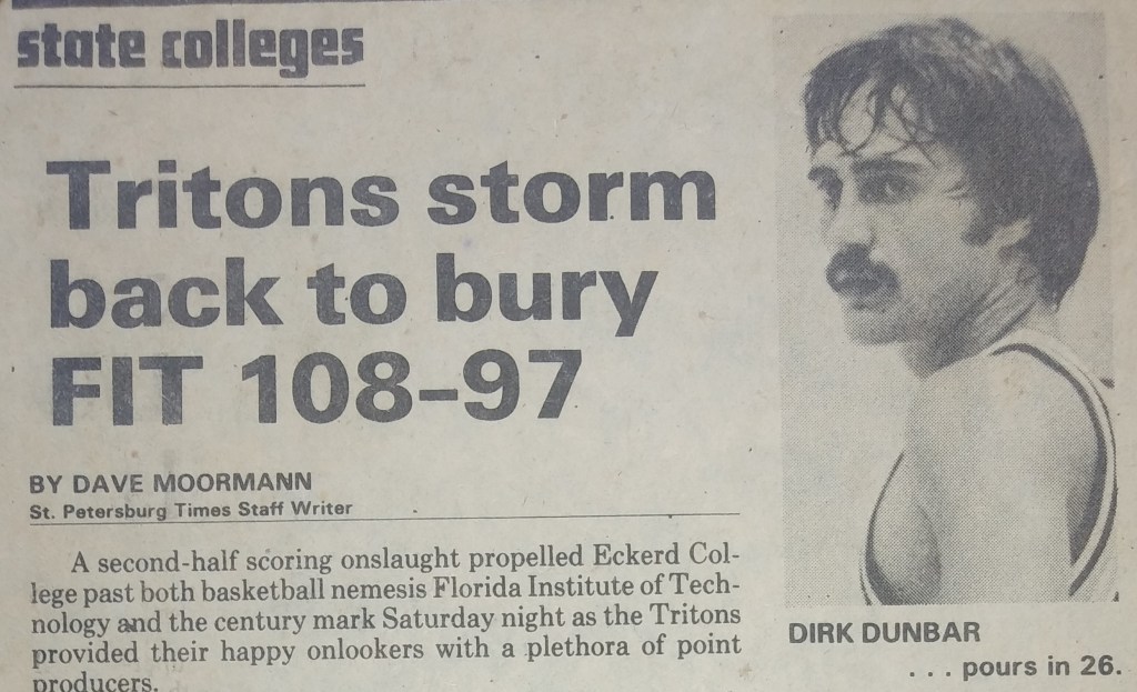 The day before our first conference game at Rollins, the Orlando Sentinel Star ran a huge article, “Dunbar’s Day: Hermeneutics, Theology, Basketball,” which started with the line, “Dirk Dunbar is trying to find meaning in his life.” After discussing my senior thesis and basketball career, the writer, Don Archer, explained how I’ve helped turn it around for Eckerd. The game was sold-out. Rollins won by 14, but we had our chances. I scored 35 and Archer started the next-day article with, “If there was any doubt before Tuesday night, there is none now, Dirk Dunbar is for real.” He quoted the Rollins and former NBA Coach, Ed Jucker, who claimed I was “sensational” and that “we tried everything on him but nothing worked (including a triple-team). He shoots anywhere—outside, inside, falling down. He must have hit ten shots while his body was parallel to the floor.” We played the defending champs, Florida Tech., three nights later. We jumped out to a 16-6 lead and I had 10 points in the first two minutes, ended up with 26, but fouled out and we lost in a well-played game.