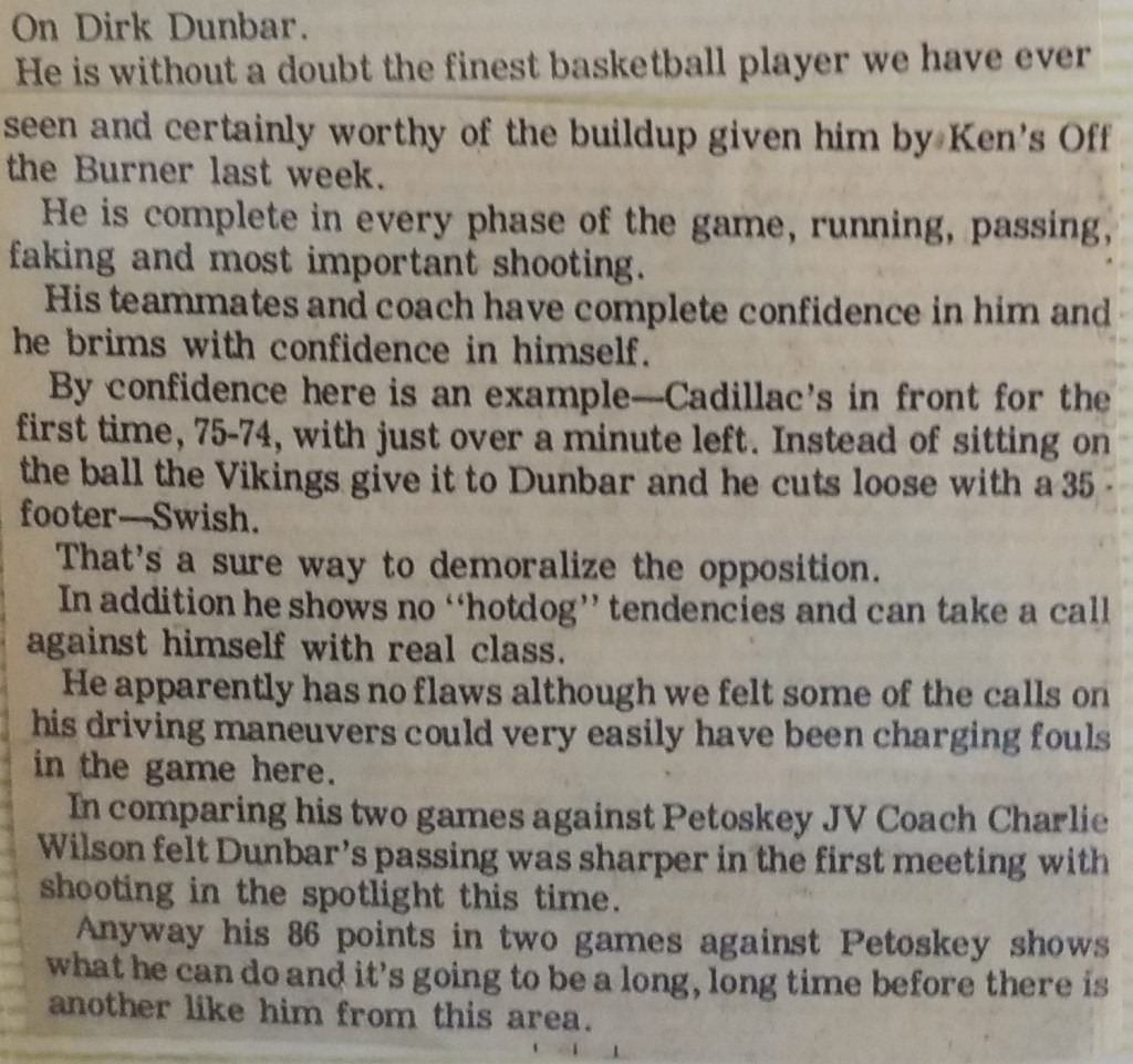 A starting guard for three years at Cadillac High School, I was first-team All-State twice and a two-time All-American. My career scoring average was over 30 points a game and I led the U.S. with 38.5 my senior year. I set the Viking game, season, and career assists as well as eight scoring records. We were rated number one in the State Class B for six weeks my sophomore year and won 16 games. We lost four of our starters the next year and were small and out-matched in most games, but went 14 and 5 my junior season, and 14 and 4 my senior season. We were scrappy. Rock Baty and Gary Johnson had good all-around games and Tom Gilbert, though only 6’1″, was a solid rebounder. The comradery was great and helped immensely. Everywhere we played gyms were packed and, more often than not, people were turned away. A Senate Concurrent Resolution highlighting my 12 school records, academics, and character was unanimously signed by the Michigan Legislature. I was a featured player in the Roundball Classic in Detroit’s Olympia Stadium which included future NBA players such as Bubbles Hawkins, Larry Fogle, Eric Money, Butch Feher, Coniel Norman, and others. My game was lauded by players, coaches, and reporters from opposing teams, as the following two articles from the Petosky paper testify.