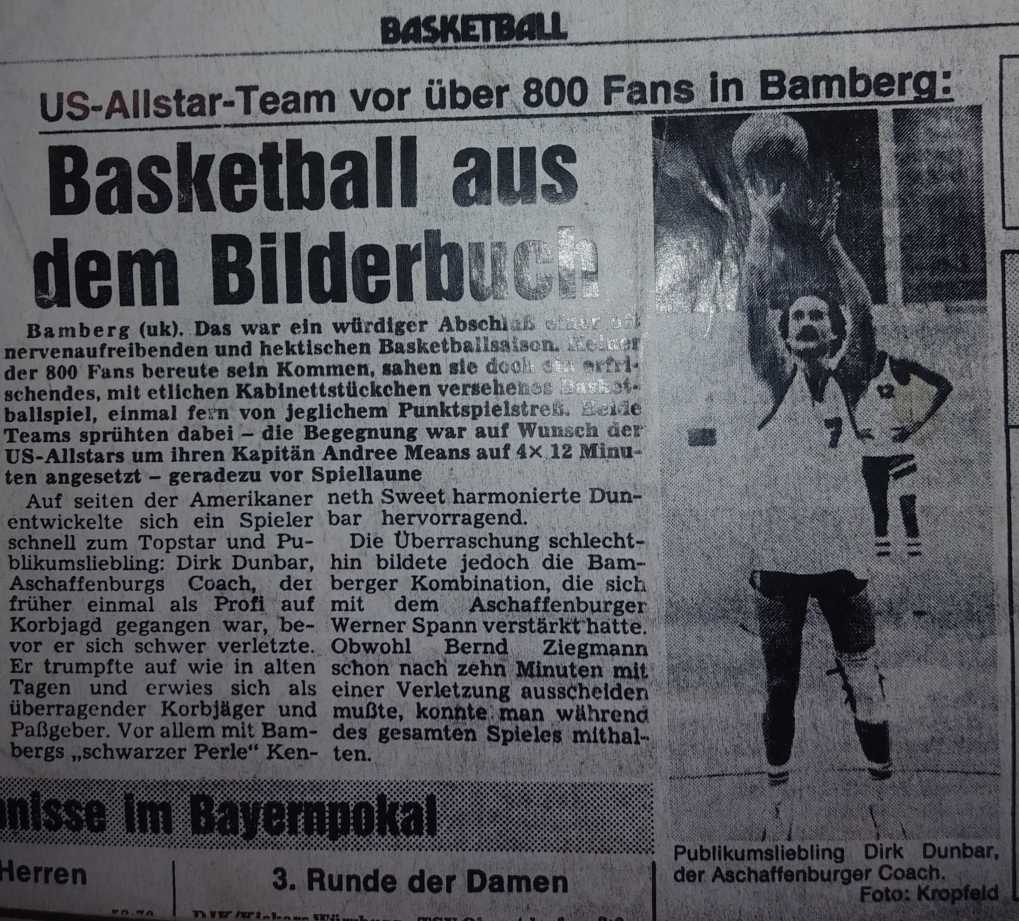 We had a great preseason, both on and off the court, but when Augsburg nailed us by 16 in the first game, writers welcomed us to the real world. I pointed out that the refs took away five baskets on three-second calls and said it would be a different story next time. I didn’t mention that I should have had ten more free throws. Instead, I ended up with two tic-tac technical fouls and was kicked out in the second half after scoring 35. Everyone knew, especially my teammates, that we would never go down without a fight. “Dunbar Shoots down Breitengussbach” was the Bayern headlines after I scored 43 in the next game, which we won by four. I had three of my six steals in the game’s last minute! We lost the next game by 3 but then won back-to-back games the next weekend, in which I scored 43 and 45. The headlines of a South-German press release covering all Regionalliga games stated, “The Dunbar-Express Rolls” (a nickname that stuck). I scored 45 again in the next game, a big road win, and the Nurnberger News headlines suggested that I “Played the Tall Guys Dizzy,” and the first sentence said I left our fans screaming and the hometown fans shaking their heads. We beat Gersthofen (the other team that advanced into our league) by 25 the next game and I had 42 despite sitting most of the second half.