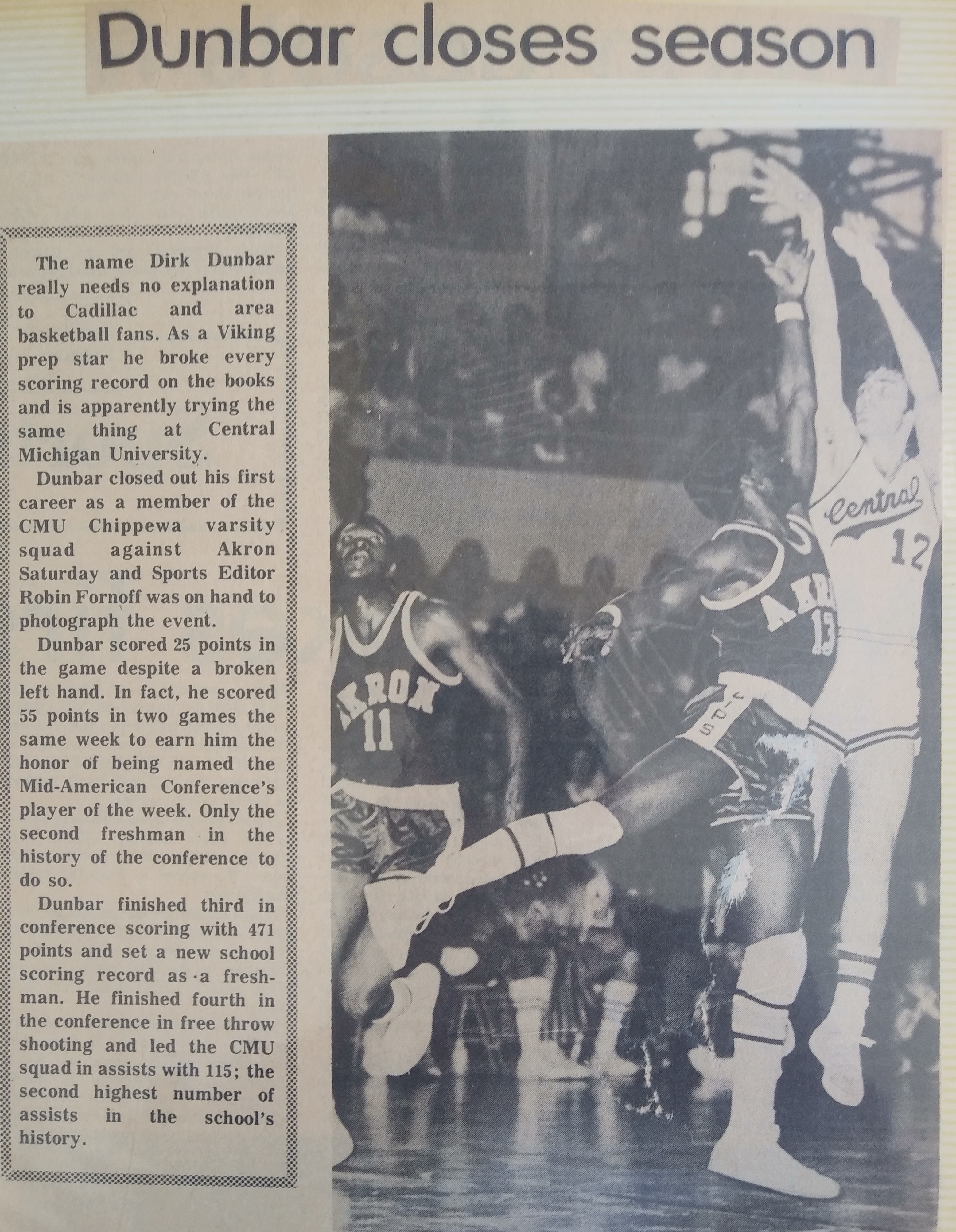 Admittedly, I was a bit disappointed early in the season, especially against weaker, non-conference opponents, because I sat too much. We lost to Calvin College (a small D2 school) and I played eight minutes but scored eight points. I had to physically stop my Dad from storming the locker room and throwing his season tickets at Coach. We also lost to Ferris State and would have lost to Wayne State had I not scored eight points in the last few minutes after sitting most of the game. But I played a lot in the Mid-American Conference games. We played Ohio U. first and I outplayed their star, Walter Luckett, who was on the cover of Sports Illustrated only days before the game. I scored 22 and had 10 assists and 8 rebounds against Illinois State, and against Eastern Illinois, I scored 12 points in limited first-half minutes but in the second half hit 9 shots in a row en route to scoring 39 for the game (including the last four that won the game). I scored 34 in a close win over Buffalo State on 12 of 19 shooting and 10 for 10 free throws while adding 6 rebounds and 6 assists. I scored 20 and dribbled out the last two minutes in a two-point win against Toledo and hit some late clutch shots and scored 21 in a one-point win against Kent State. In our last conference game, I snapped my fourth metacarpal in my left hand in the first half against Western Michigan, got taped up, and was instrumental in our two-point win. The following two games, the last of the season, I played with a cast wrapped with foam padding and scored 30 points (16 in the last four minutes) against Northern Illinois, 25 versus Akron, and was named MAC player of the week.