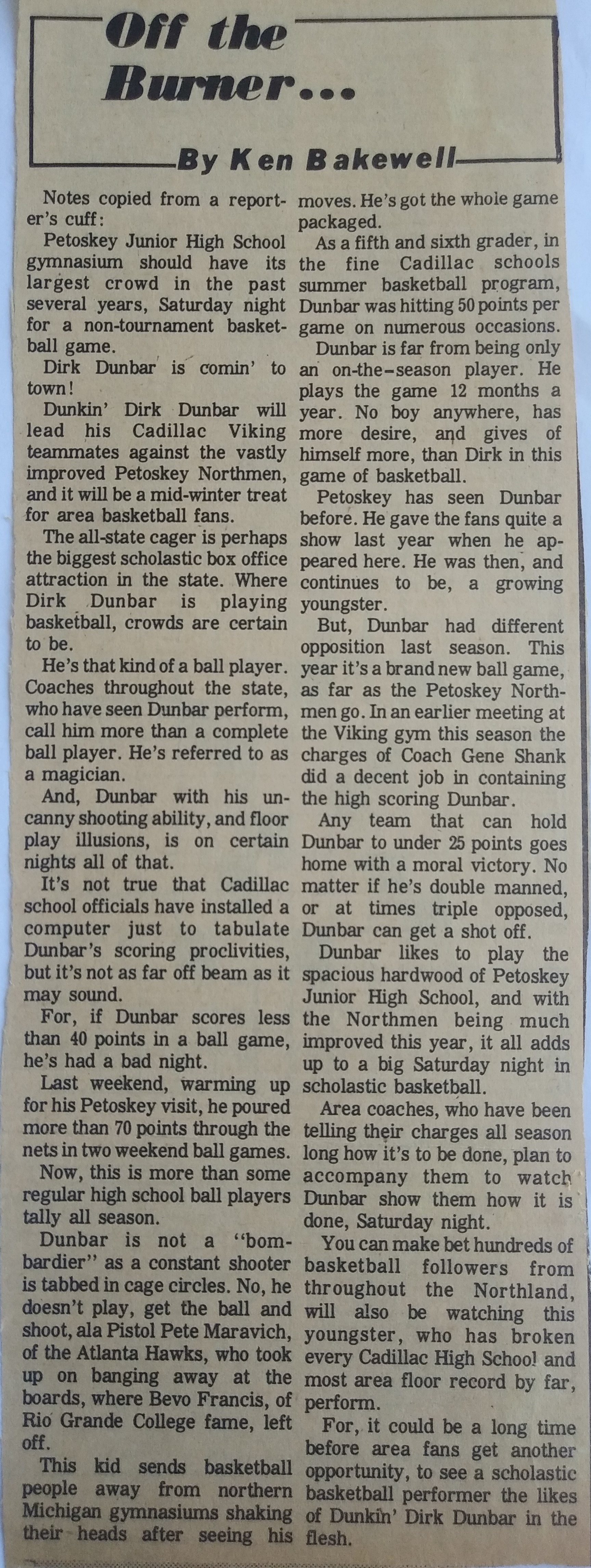 A starting guard for three years at Cadillac High School, I was first-team All-State twice and a two-time All-American. My career scoring average was over 30 points a game and I led the U.S. with 38.5 my senior year. I set the Viking game, season, and career assists as well as eight scoring records. We were rated number one in the State Class B for six weeks my sophomore year and won 16 games. We lost four of our starters the next year and were small and out-matched in most games, but went 14 and 5 my junior season, and 14 and 4 my senior season. We were scrappy. Rock Baty and Gary Johnson had good all-around games and Tom Gilbert, though only 6’1″, was a solid rebounder. The comradery was great and helped immensely. Everywhere we played gyms were packed and, more often than not, people were turned away. A Senate Concurrent Resolution highlighting my 12 school records, academics, and character was unanimously signed by the Michigan Legislature. I was a featured player in the Roundball Classic in Detroit’s Olympia Stadium which included future NBA players such as Bubbles Hawkins, Larry Fogle, Eric Money, Butch Feher, Coniel Norman, and others. My game was lauded by players, coaches, and reporters from opposing teams, as the following two articles from the Petosky paper testify.