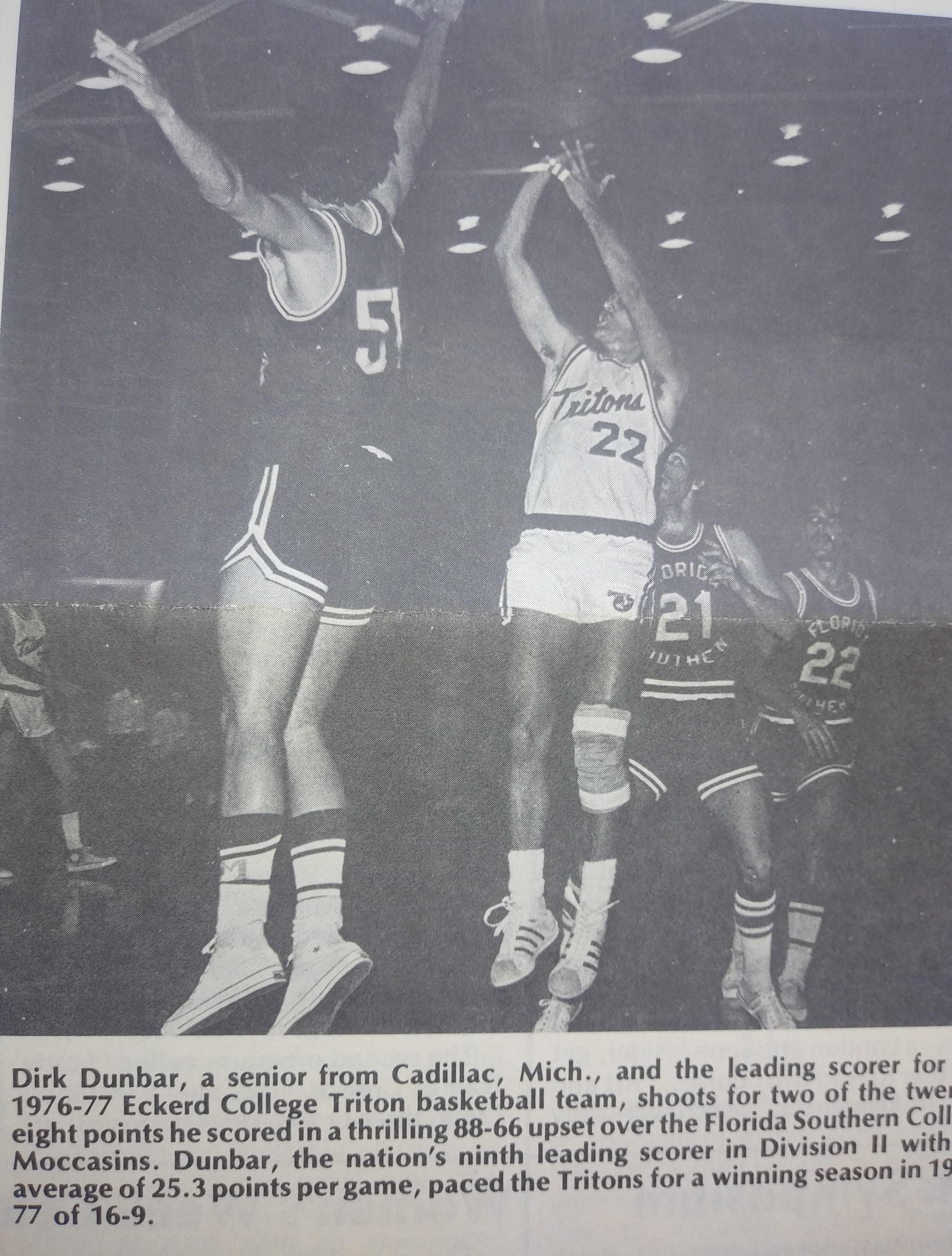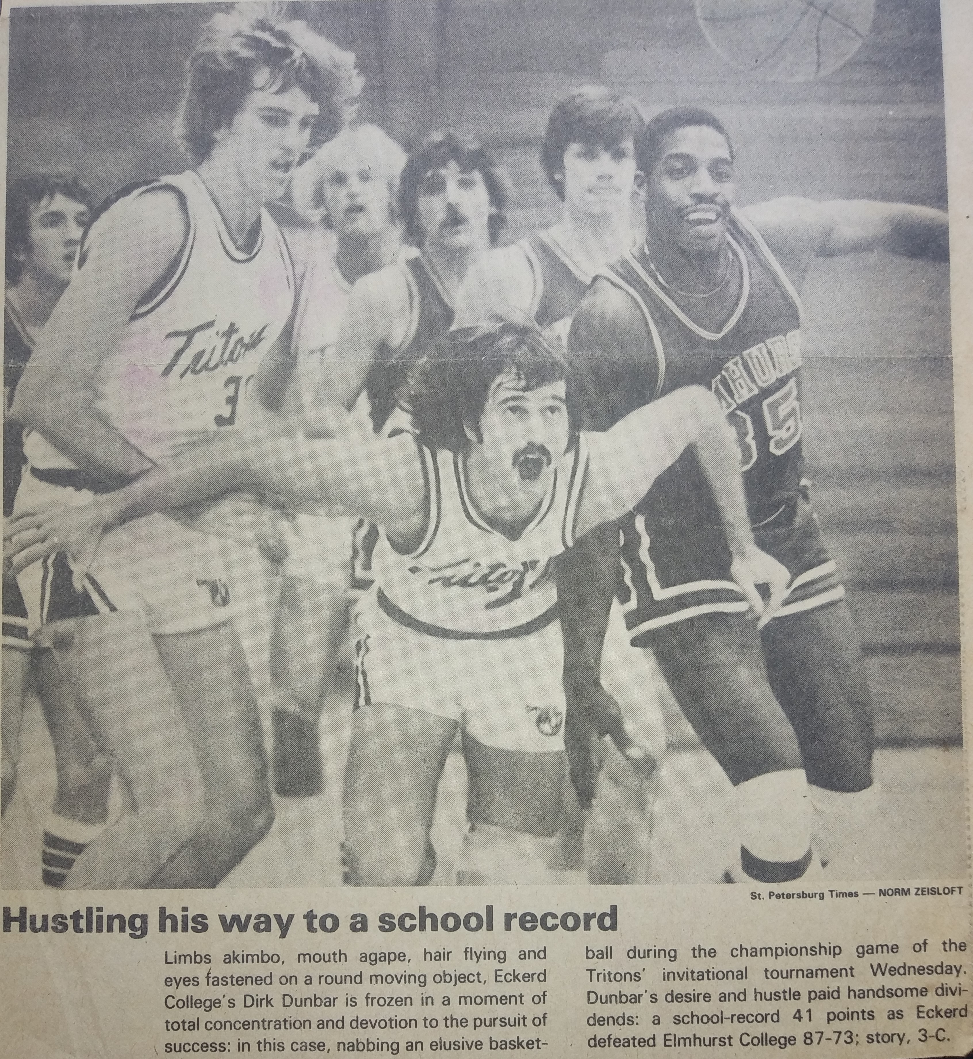 We won our first eight games (still a school record) and Coach played me as many minutes as necessary. For instance, in our third game against U. of Illinois at Chicago Circle (the first team we played my freshman year at Central), I scored 14 points in a two-minute surge late in the second half. After our fifth straight win, a page-and-a-half St. Petersburg Times article, “Dunbar is Knee High in Class,” covered my career and put the Tritons and me on the radar. I played a lot of minutes in our Christmas tournament, which we won. I scored 25 and 41 points (still the school record) and was MVP. I was having immense fun.