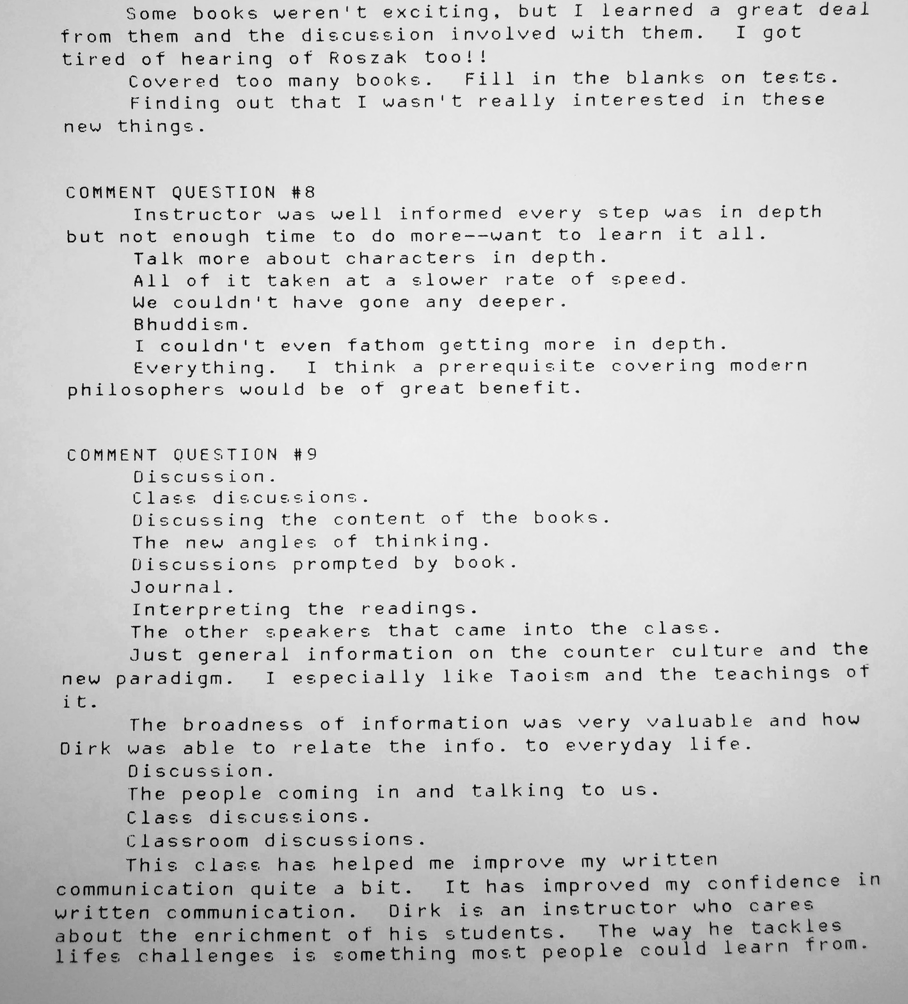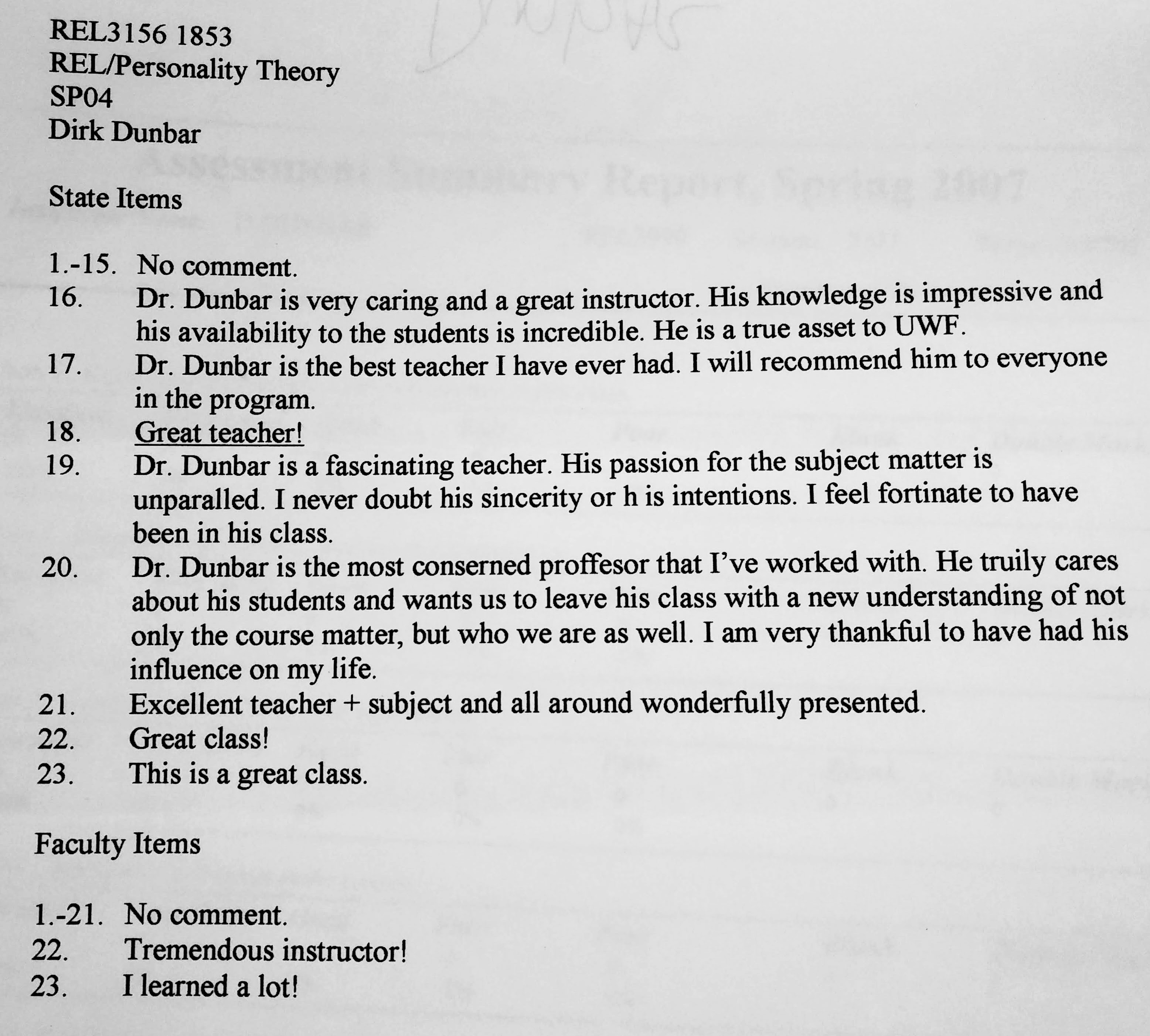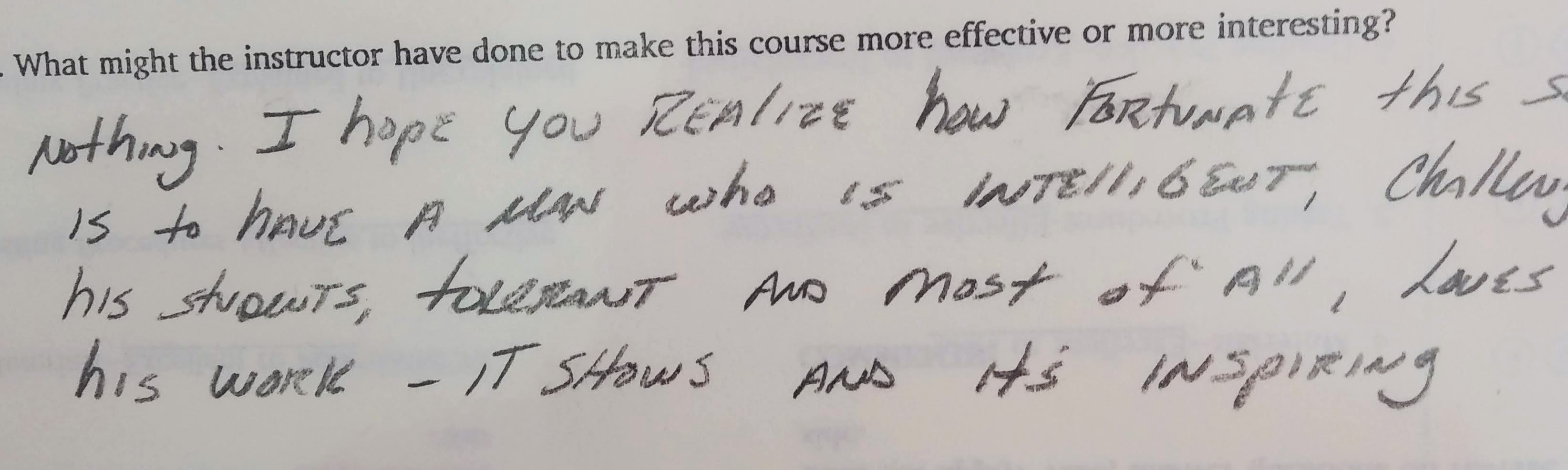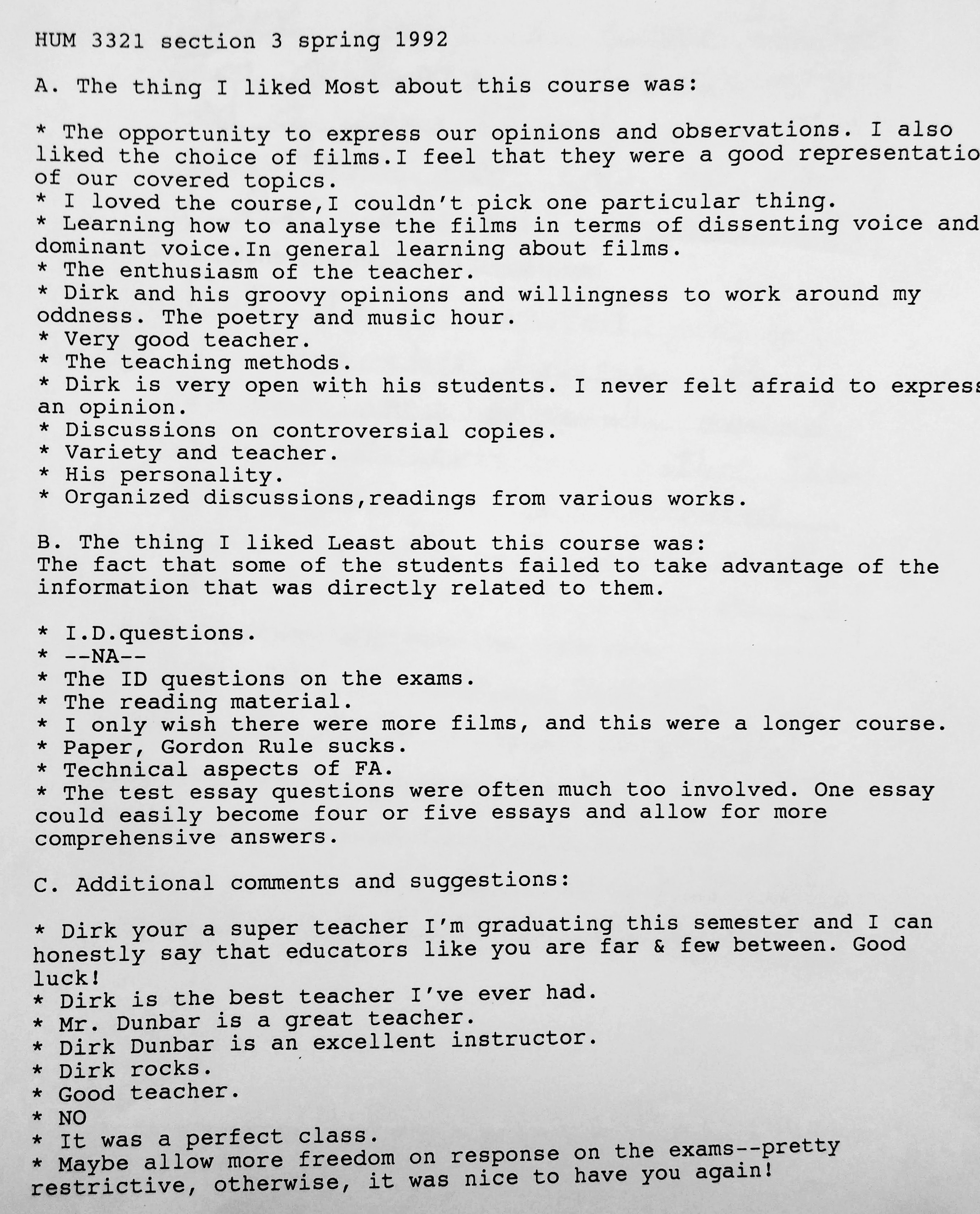 The following comments are from a film class during my last semester at FSU when the department started typing the evaluations: