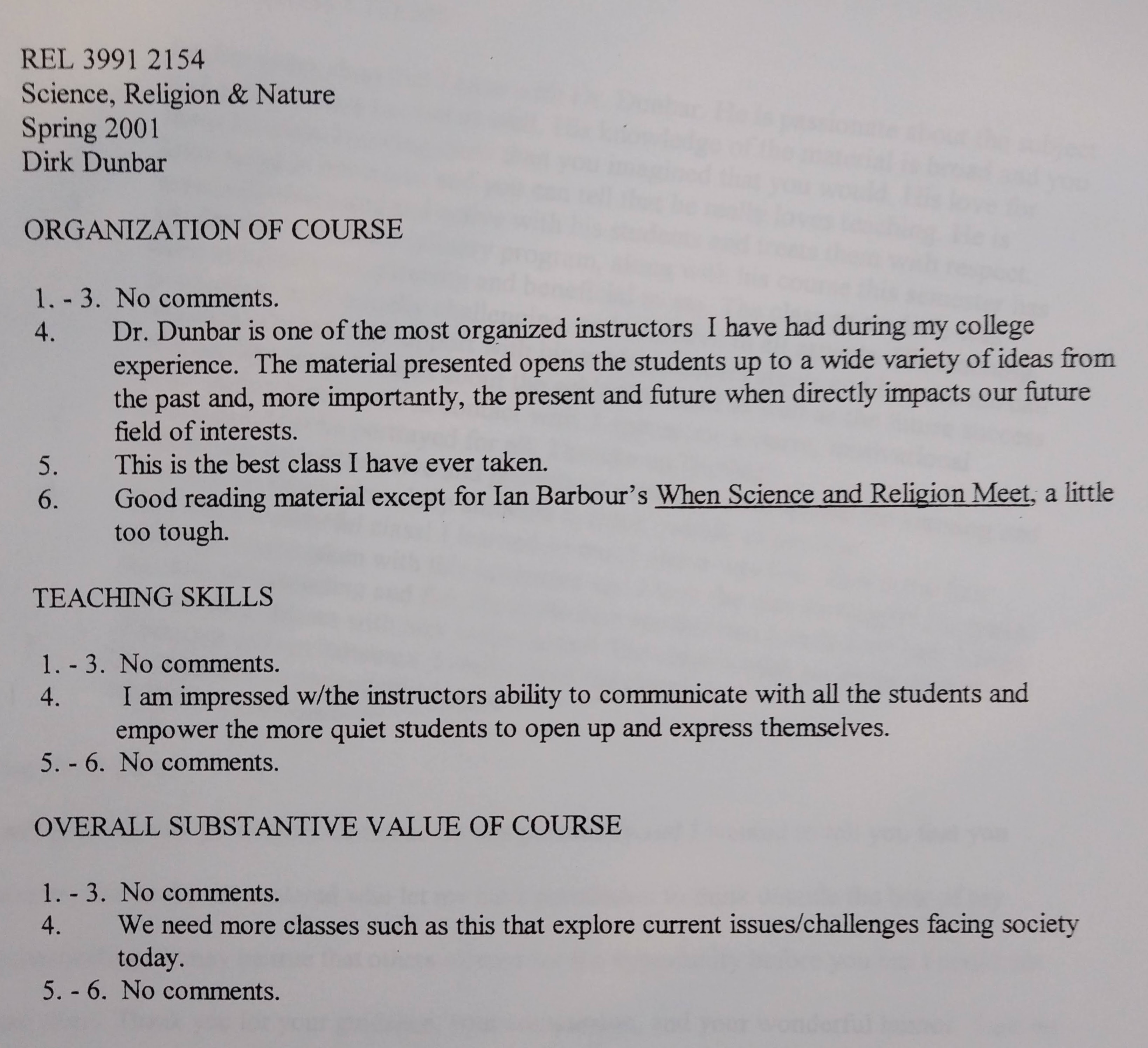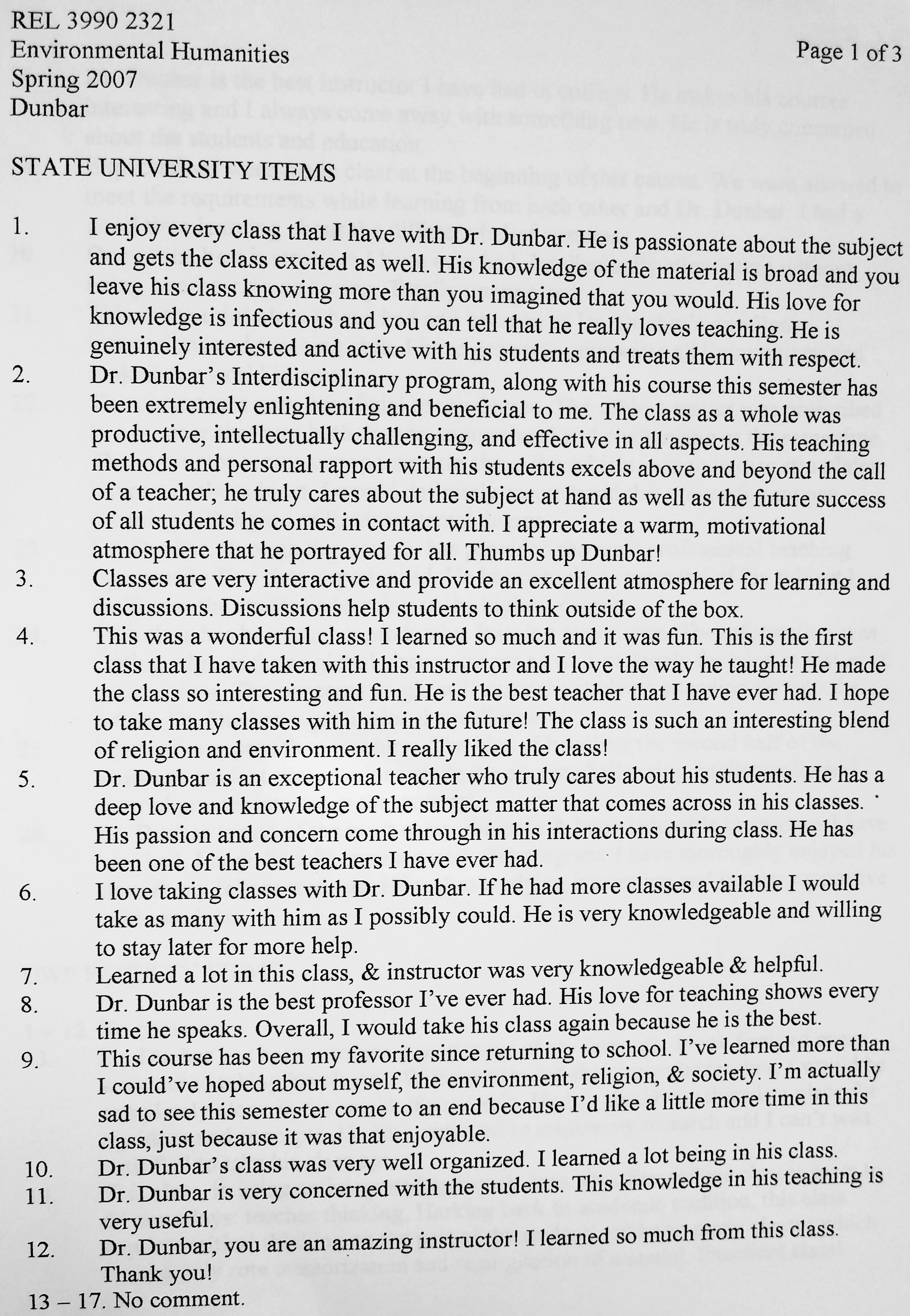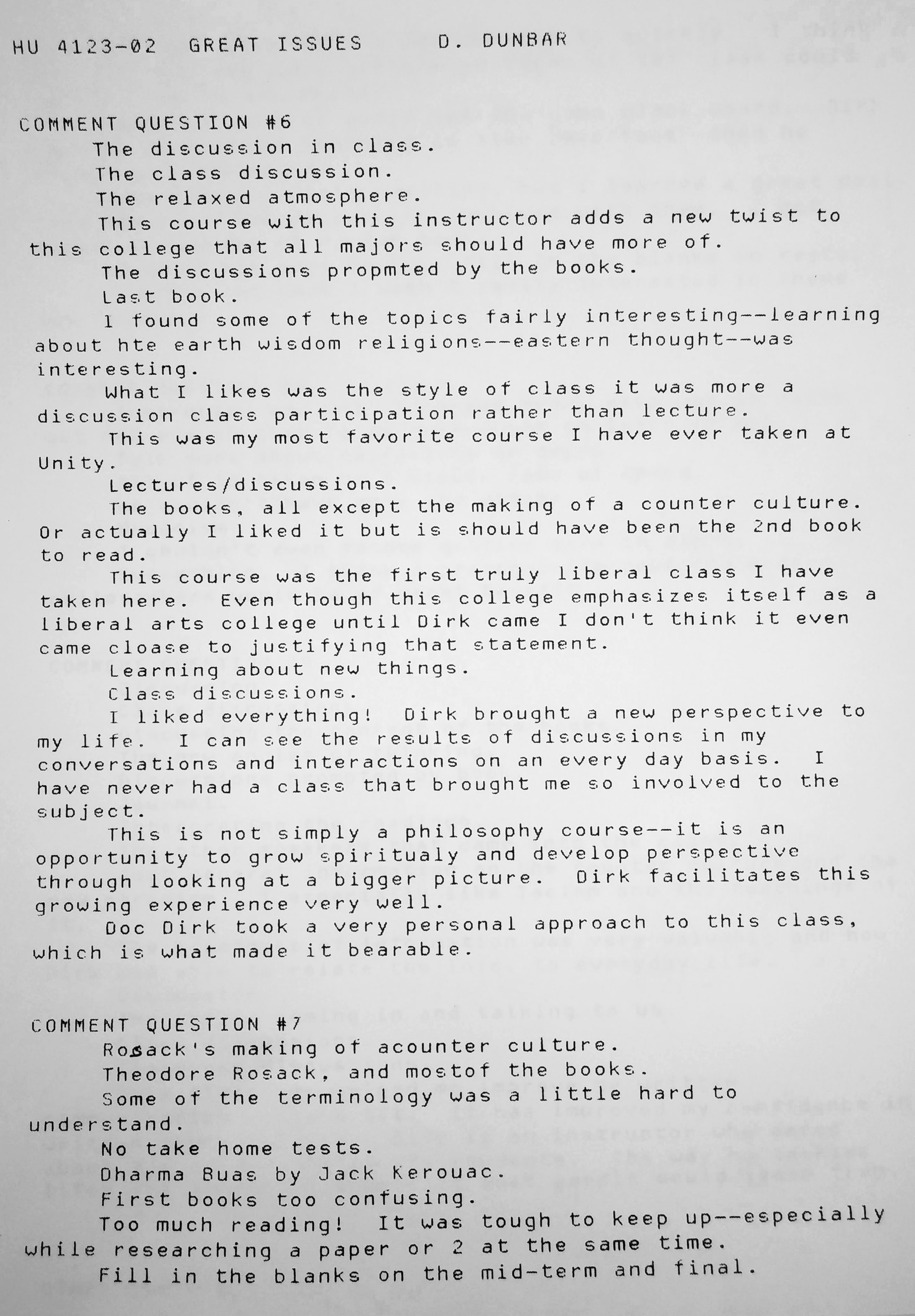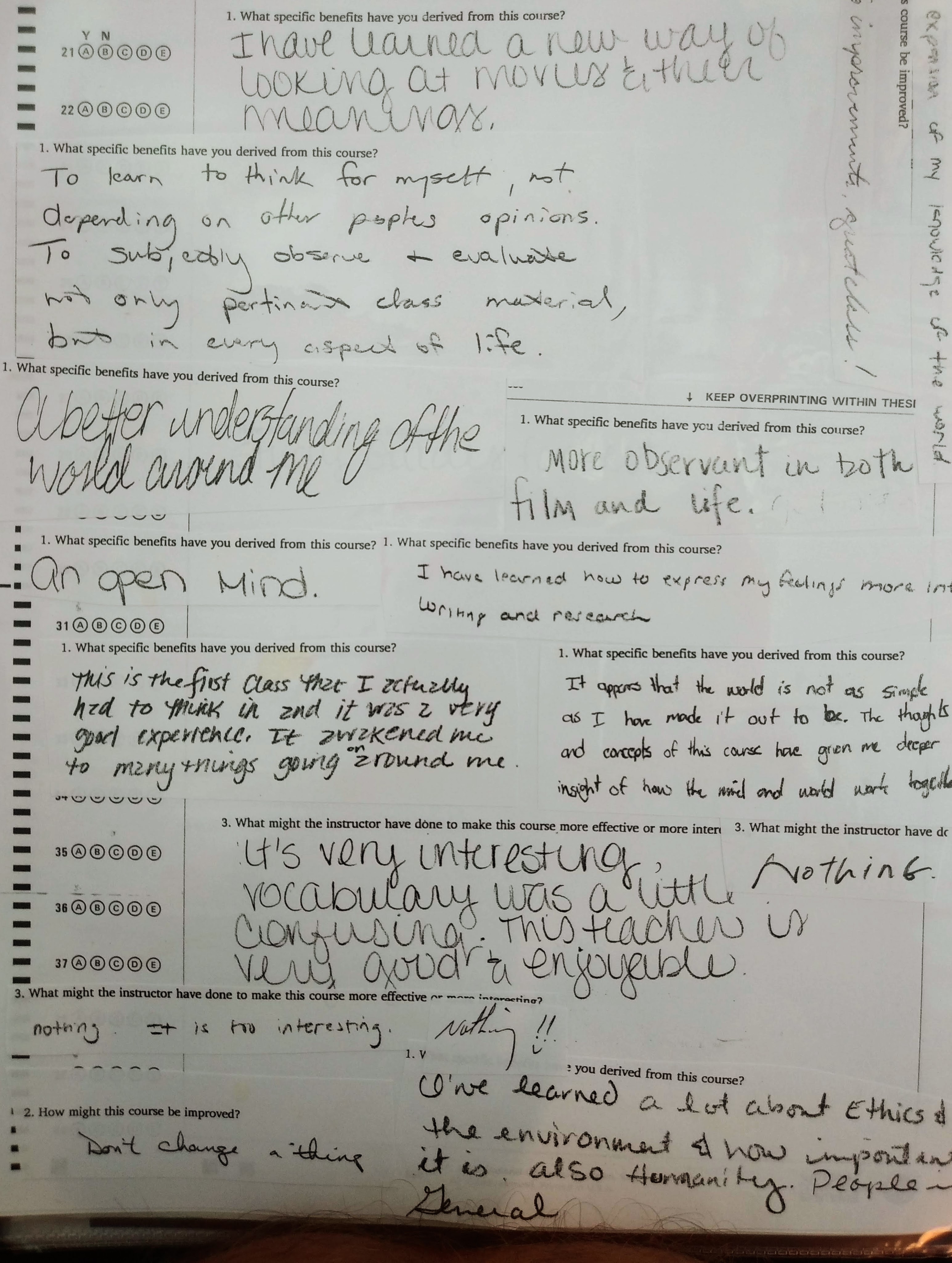 The following comments are from a film class during my last semester at FSU when the department started typing the evaluations:
