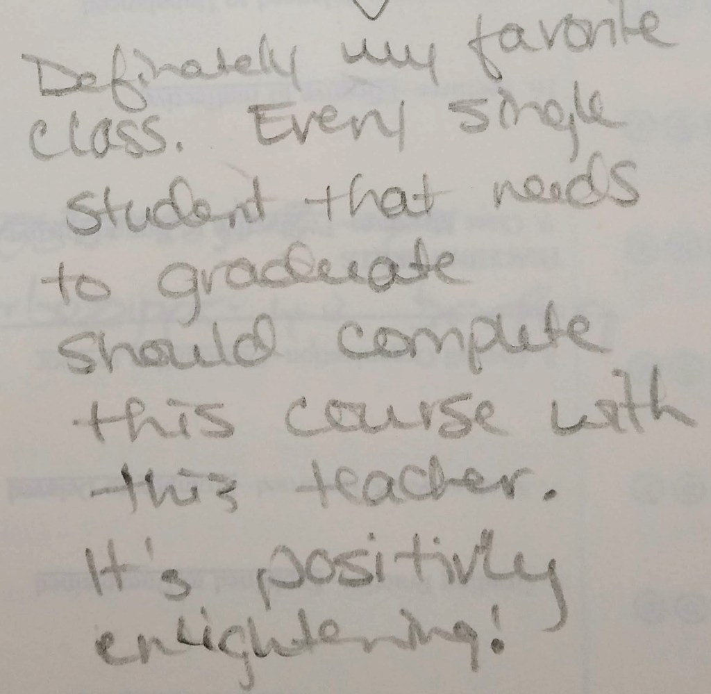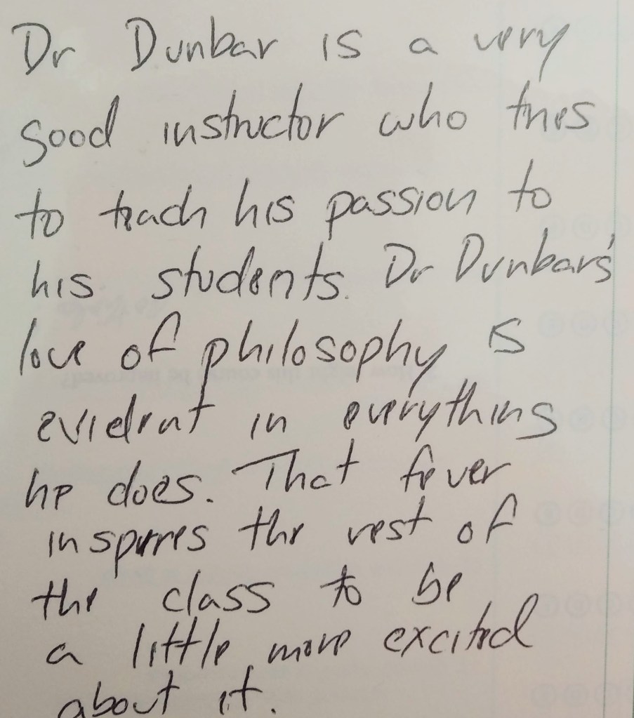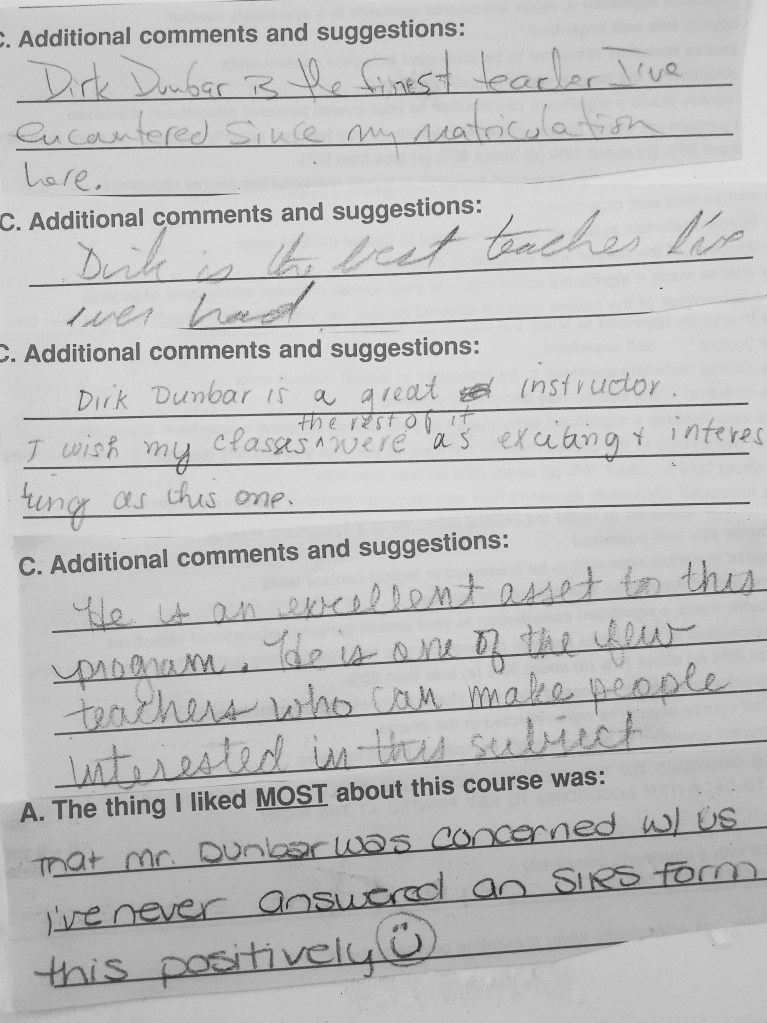 I don’t know much about your life, or your family, but I appreciate that these people and experiences helped forge a professor capable of teaching his students to know and trust themselves and to be excited about knowledge. I believe educators like you are one of our most important assets, and you should know, even if only for yourself, the positive impacts you have had on so many lives. So thank you for being such a rad dude, Doc.