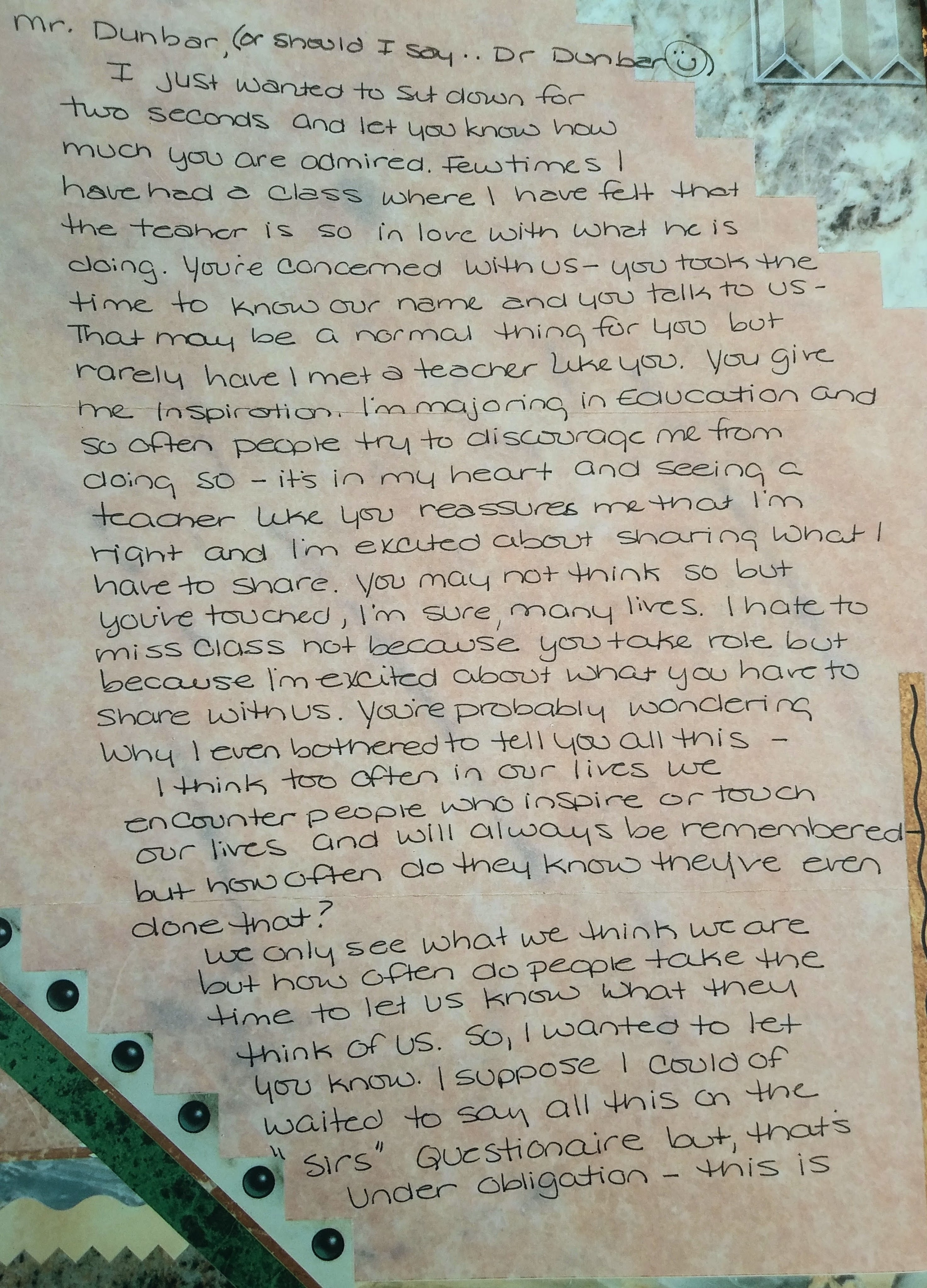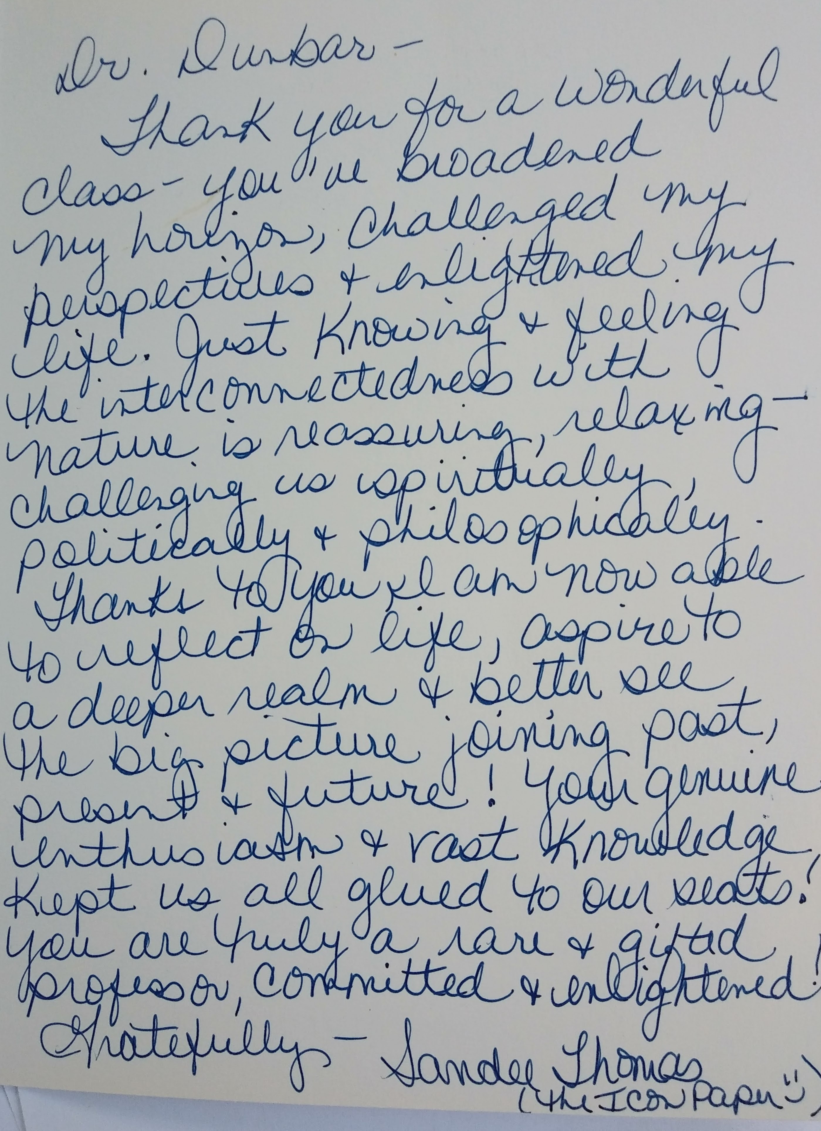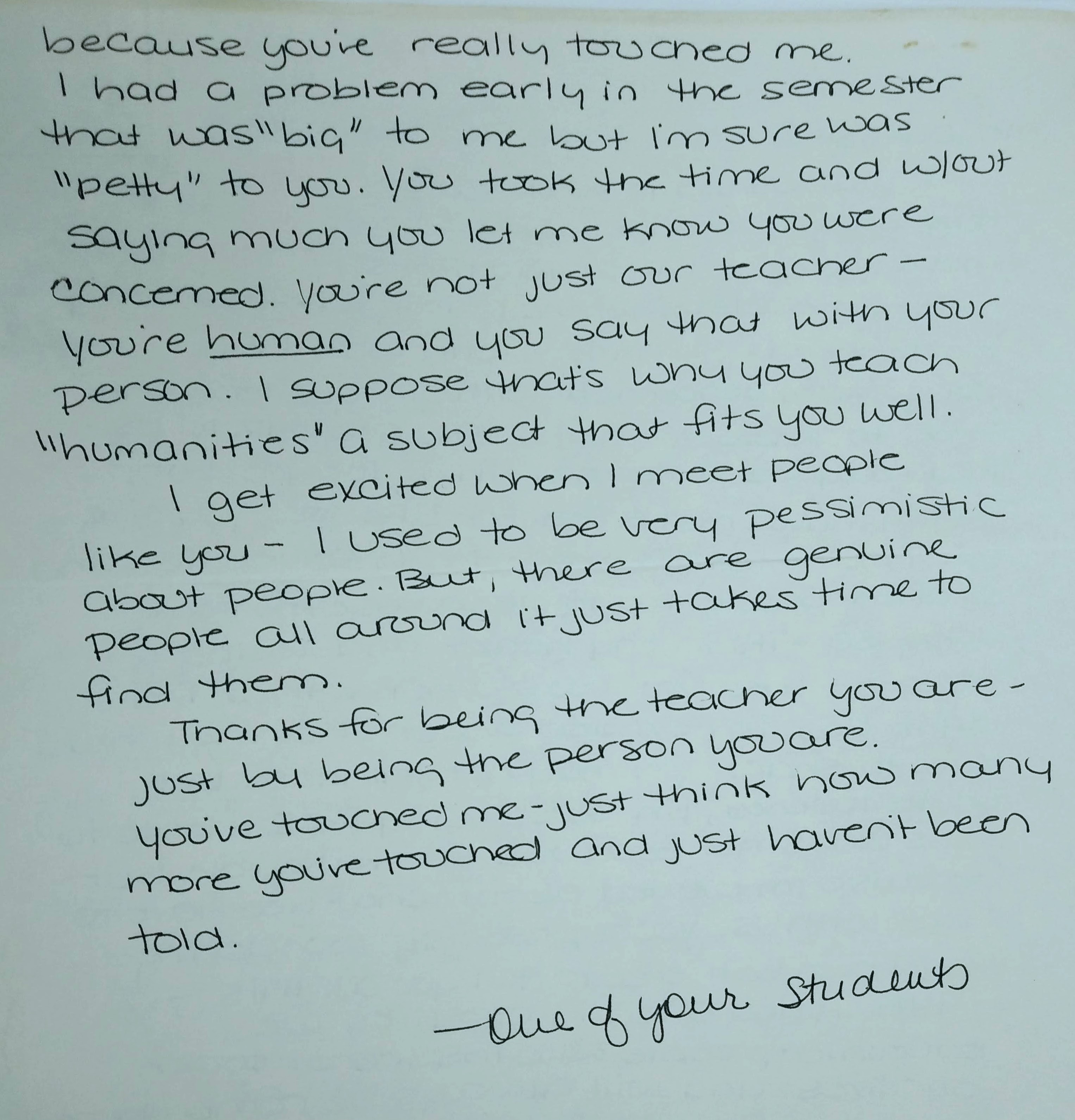I don’t know much about your life, or your family, but I appreciate that these people and experiences helped forge a professor capable of teaching his students to know and trust themselves and to be excited about knowledge. I believe educators like you are one of our most important assets, and you should know, even if only for yourself, the positive impacts you have had on so many lives. So thank you for being such a rad dude, Doc.
