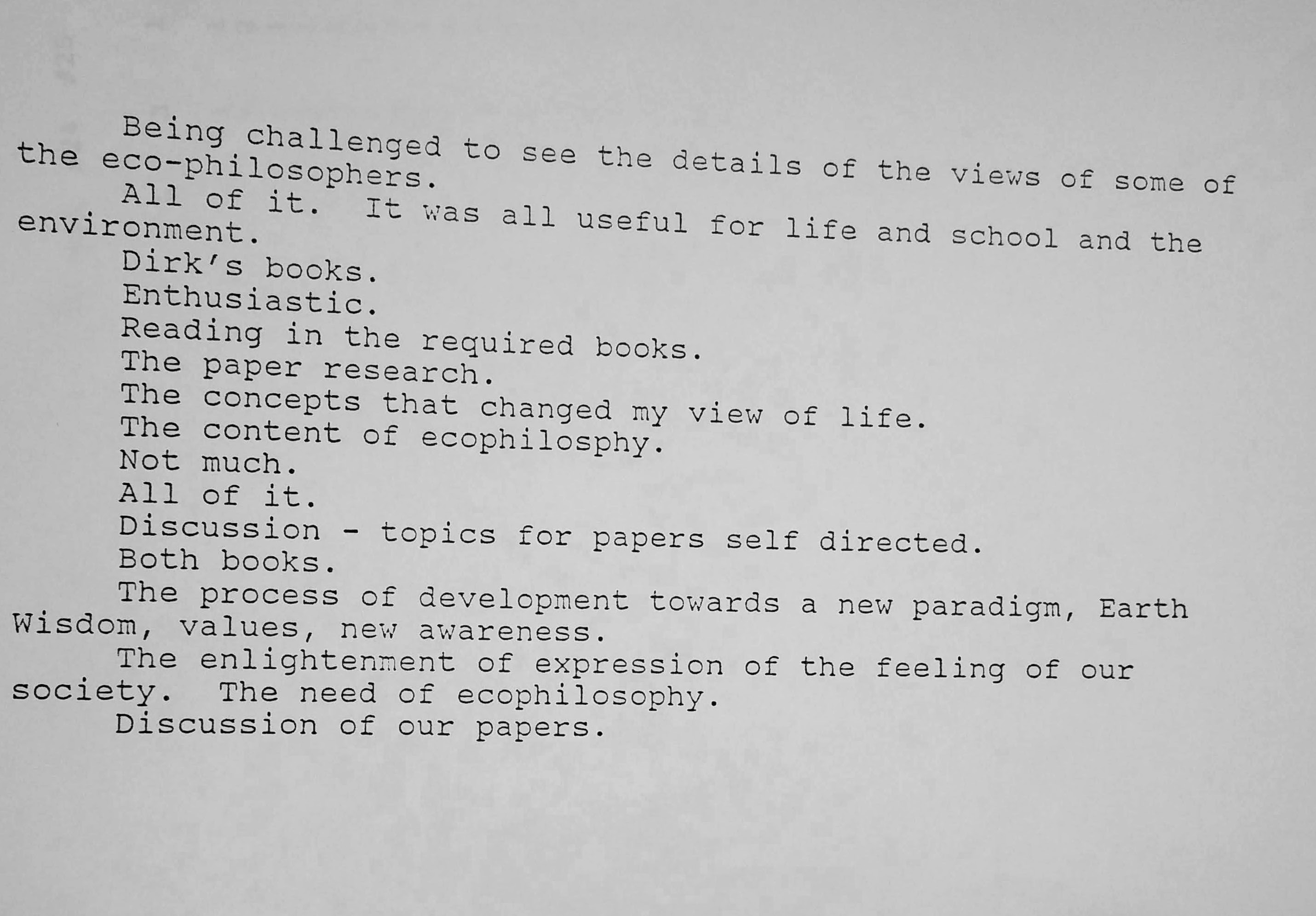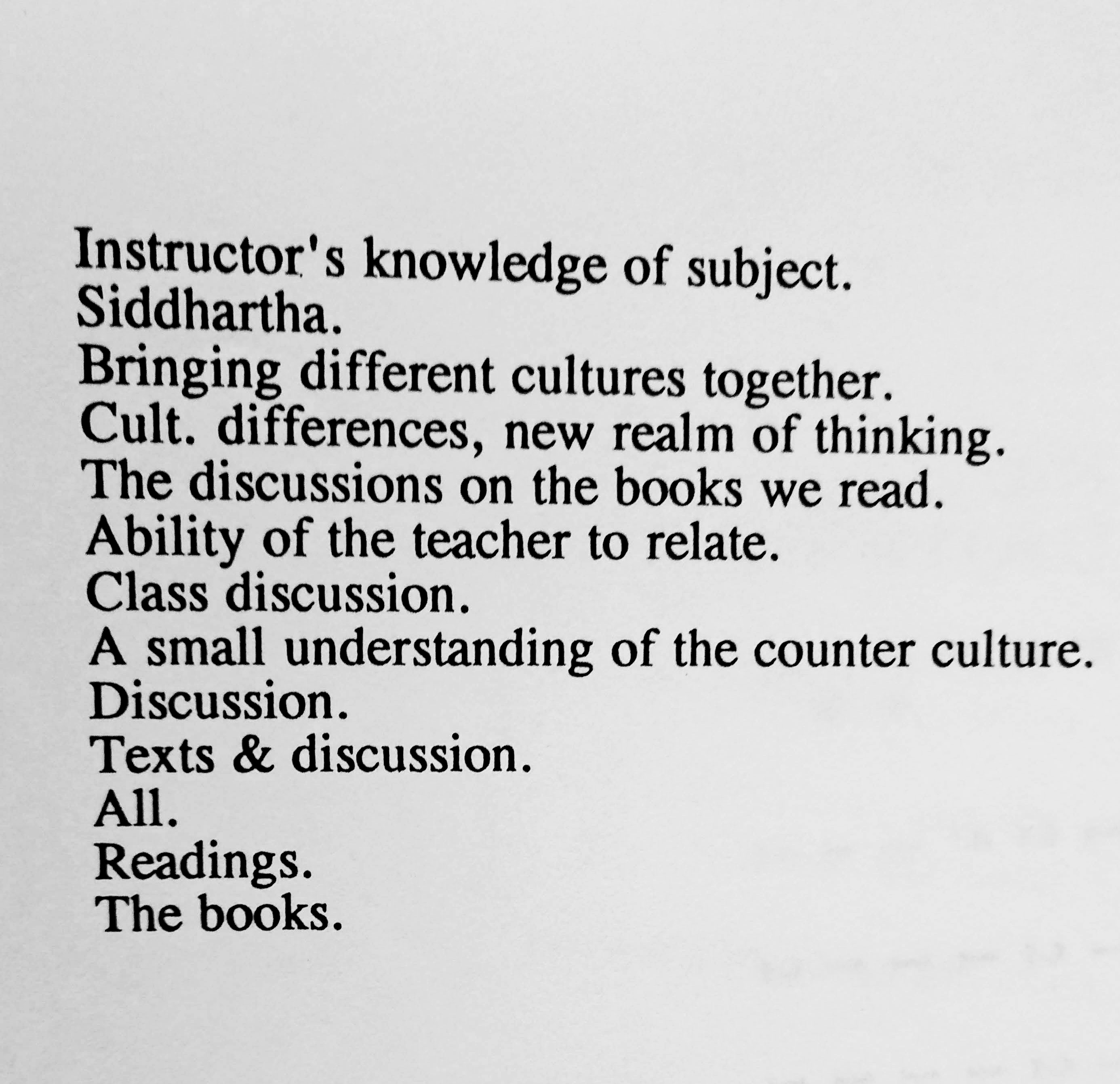 During my second and third years there, I added a few topics courses–Animal Rights (which I co-taught), Ecophilosophy, and The Meeting of East and West in Contemporary Culture–that were instant hits. The latter two became part of my teaching cycle. I really enjoyed the Ecophilosophy class and the discussions seemed to give a deeper purpose to students’ passion for nature, and they were not afraid to say so. Unfortunately, I do not have any extant syllabi but I remember we read Henryk Skolimowski’s Eco-Philosophy: Designing New Tactics for Living and a handbook I put together filled with essays from some of my favorite scholars. For the East meets West class we read Theodore Roszak’s The Making of a Counter Culture, Fritjof Capra’s The Turning Point, Ram Dass’s Be Here Now, Hermann Hesse’s Siddartha, Jack Kerouac’s The Dharma Bums, and Robert Pirsig’s Zen and the Art of Motorcycle Maintenance. There was definitely a hippie vibe at the college–shared many by students and faculty alike–and that class captured it. As with all my classes, I would change the environment. We would almost always sit in circles, go outside now and then (there were some great natural places to sit in a circle), or occasionally meet in the Student Center. Students would often lead various parts of the discussion on certain sections of the readings; I would have a couple of guest speakers; would occasionally show slides or documentaries; and, along with tests and papers, students wrote informal journals. I was always open to suggestions and willing to implement changes. Teaching is a two-way street.