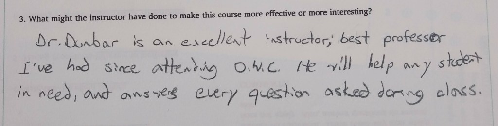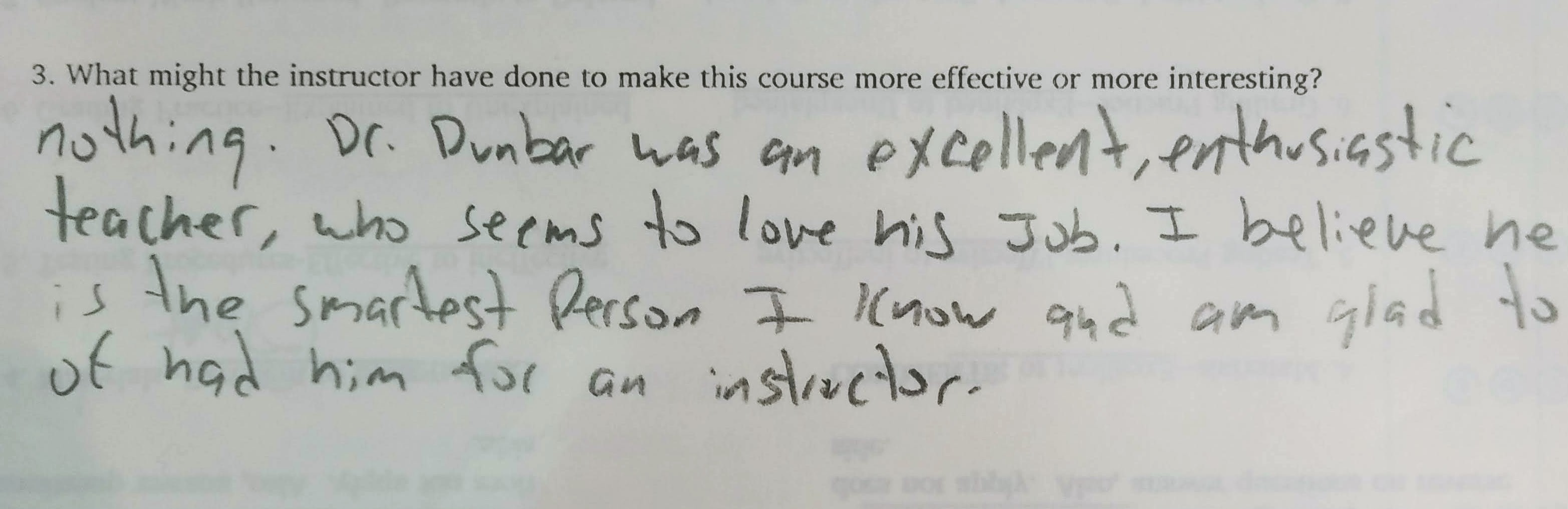 - Dr. Dunbar is very enthusiastic about what he’s teaching, and that helps make the class fun and easier to learn in. He knows most of the information off the top of his head, and that is truly a gift when you are teaching, because when you know what you’re teaching someone else and are excited about it-that is when the students will learn the most. The only way to improve the course would be to add some small quizzes, maybe for participation grade only, to sort of get ahold of how the tests will be before we take them. Besides that, keep up the amazing work you’re doing, Dr Dunbar!