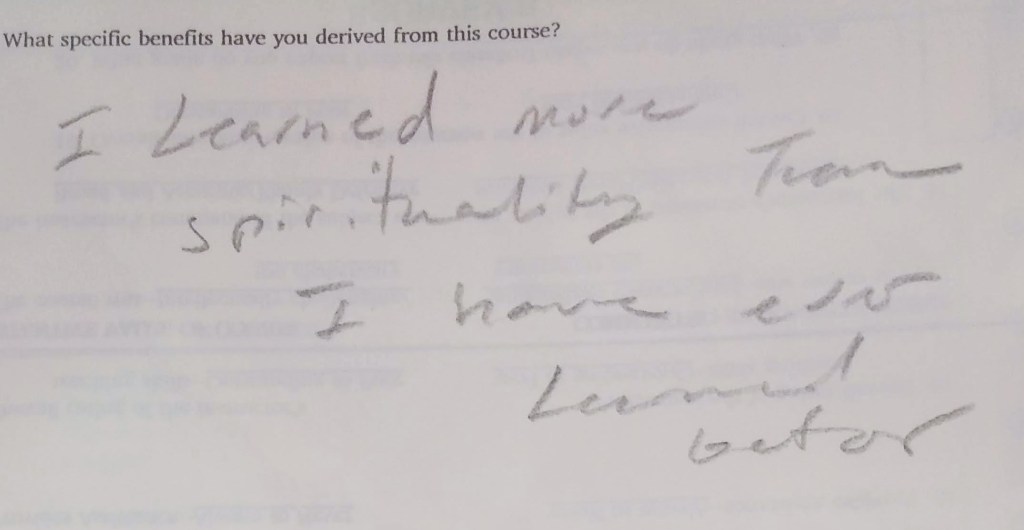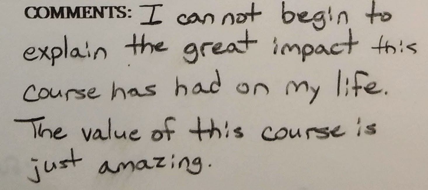 - This wasn’t like any other class I’ve ever taken in my life. I had a lot of “ah ha!” moments. It was the best and I’m very upset it’s over. The course is best at night when there is only 16-20 ish students. That’s when we really connect and learn.