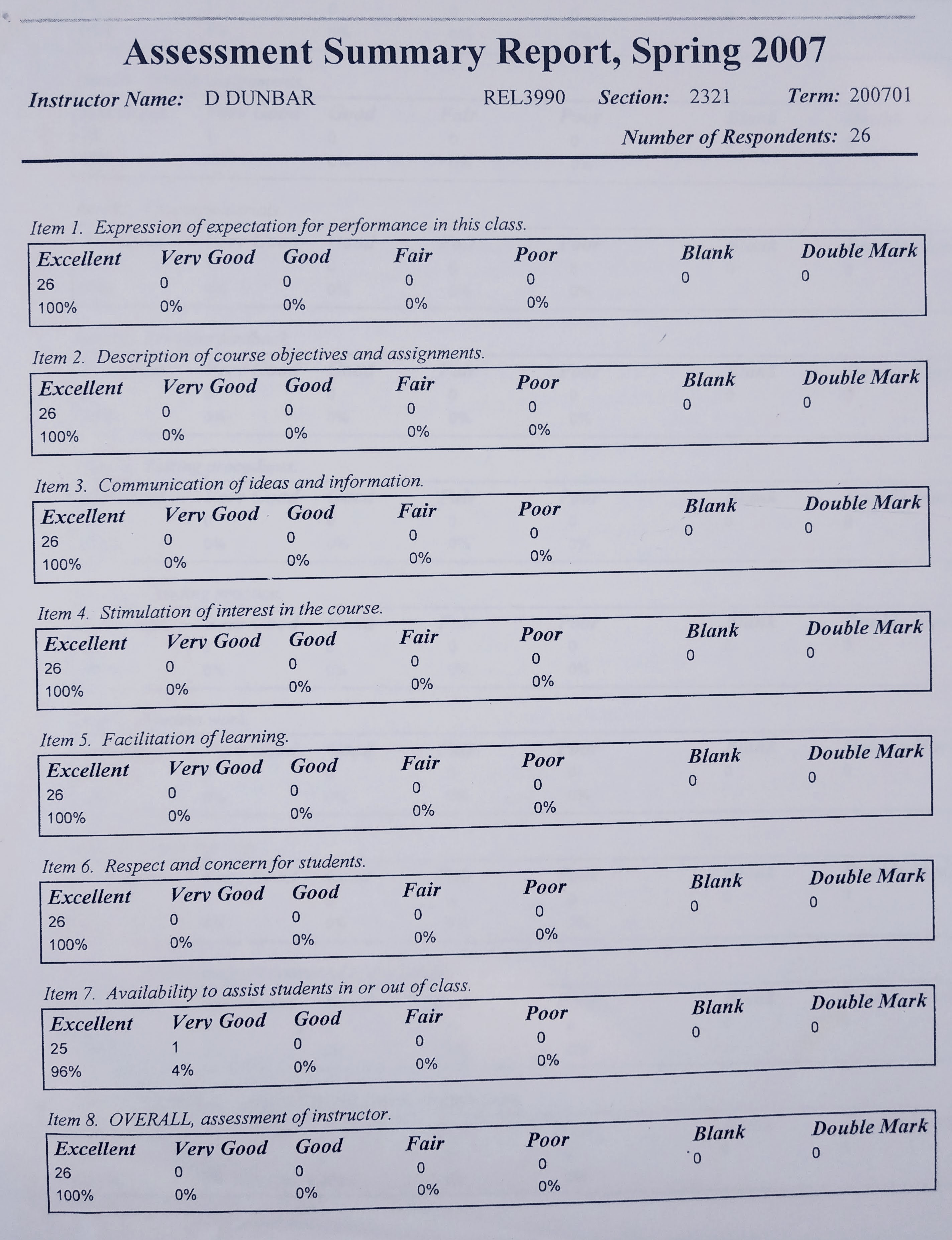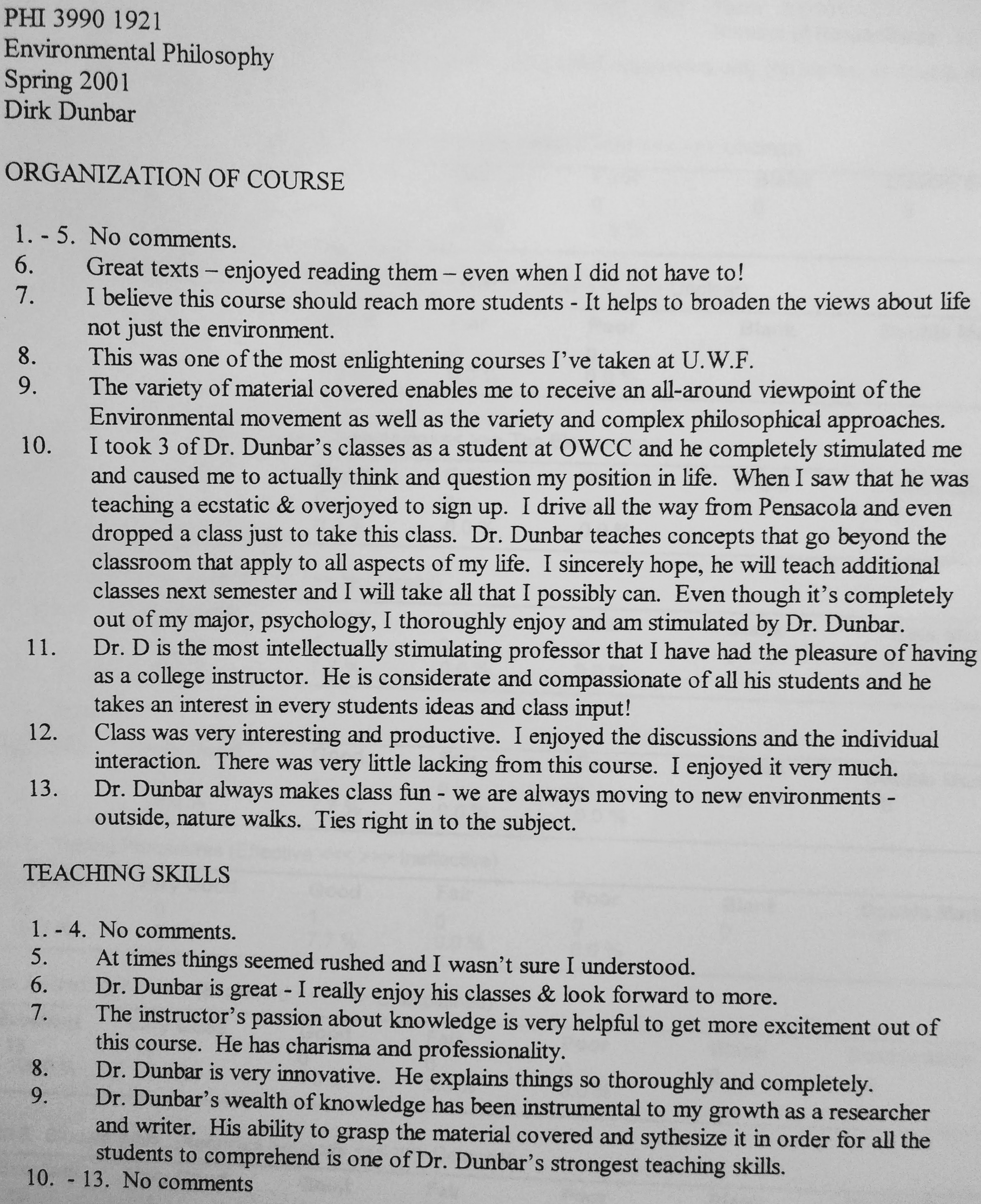 I won three UWF Outstanding Instructor awards and a Teaching Award from the National Institute for Staff and Organizational Development. I received some of my most remarkable student evaluations while teaching for and administrating the program, including multiple courses where all the students gave me 100% ratings and offered extremely positive comments—as the following comments indicate: