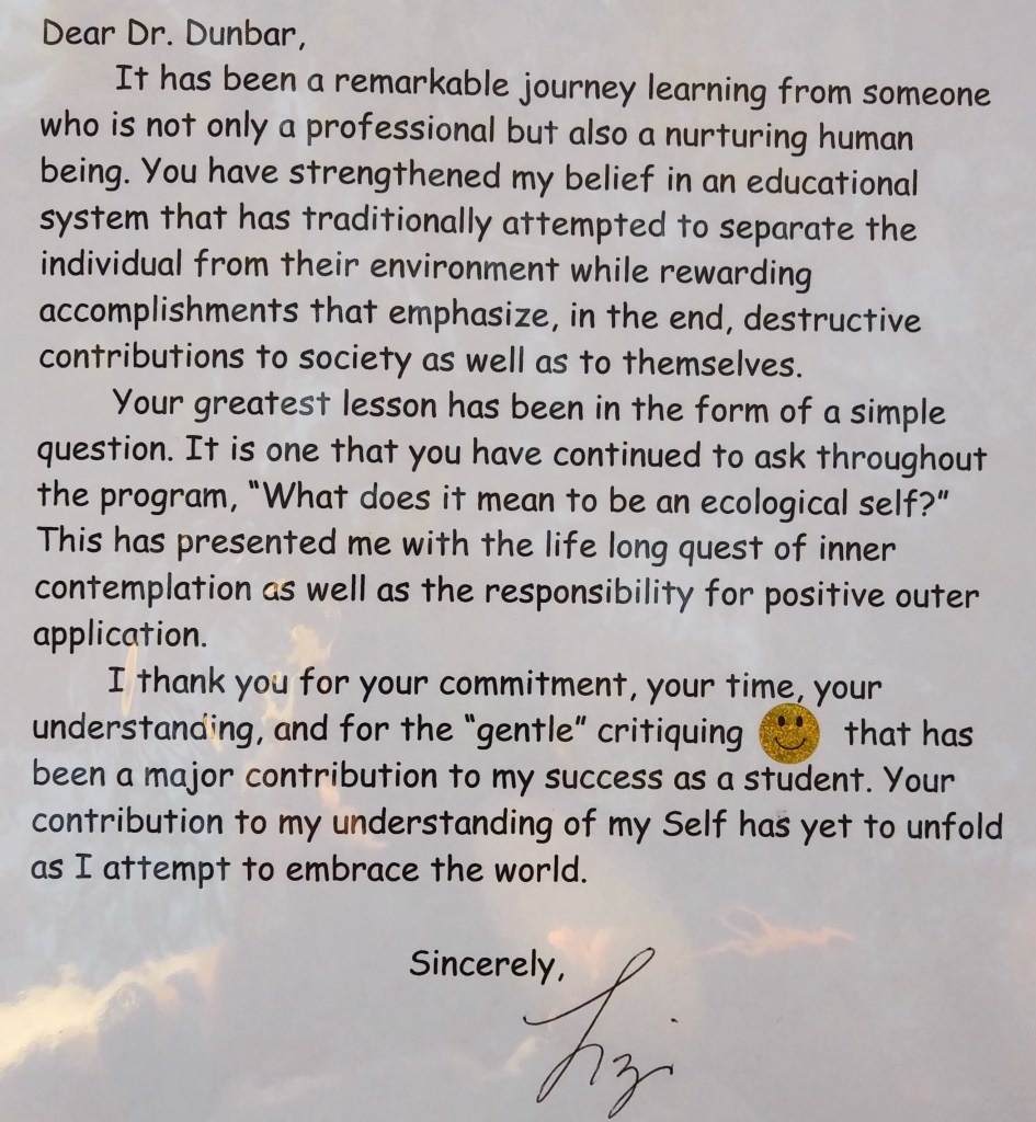 Of course, living and traveling throughout Europe and elsewhere (including Greece and Egypt) for eight years was an education in itself, but after reaching 30 I realized I wanted a career in education. So I took my GREs, enrolled in an Interdisciplinary Humanities Master’s program (exactly what I was looking for), and we left Germany for the University of West Florida. We loved Pensacola and made it to the beach often. We lived on campus in a married housing dorm and made a lot of lifelong friends. My studies were everything I’d hoped. Philosophy, Religion, and Art History were my areas of concentration. The program director, Robert Armstrong awarded me a grant and his Humanistic Understanding seminar was great. We would read a book, take notes on it, and lead a discussion based on major ideas. I remember mine: Ken Wilber’s Eye to Eye: The Quest for the New Paradigm, Robert Pirsig’s Zen and the Art of Motorcycle Maintenance, Alan Watts’ Nature, Man, and Woman, and The Only Dance There Is by Ram Dass. I also enjoyed my American Romanticism and art history courses, but my Philosophy of Comparative Religion was a game changer. I wrote a paper on “The Spirit of Ecology” and coalesced various deep ecology and ecofeminist perspectives into my own. Environmental philosophy has remained a mainstay in my approaches to learning and teaching.