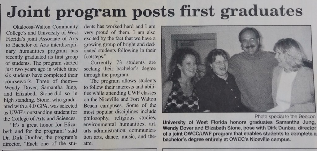 In the fall of 2000, the University of West Florida and OWCC received a grant to initiate an AA to BA Interdisciplinary Humanities program. Having an abundance of experience in learning, teaching, and administrating humanities, I was selected to serve as the director. It was a fantastic job and the source of some of my most meaningful work. For me, it was an easy sell. I was in charge of recruiting, advising, and organizing teachers for our courses at various campuses (including ones in Defuniak Springs, Niceville, Ft. Walton Beach, and Pensacola), was a liaison for each of those campuses, supervised two co-workers and graduate assistants, offered my own classes, assisted in marketing, arranged and/or participated in countless meetings, and coordinated disciplines between OWC and UWF. As you can tell from that list of courses I taught (some of which I created and others that I pulled from the UWF class catalog), I was having the time of my life in the classroom.
