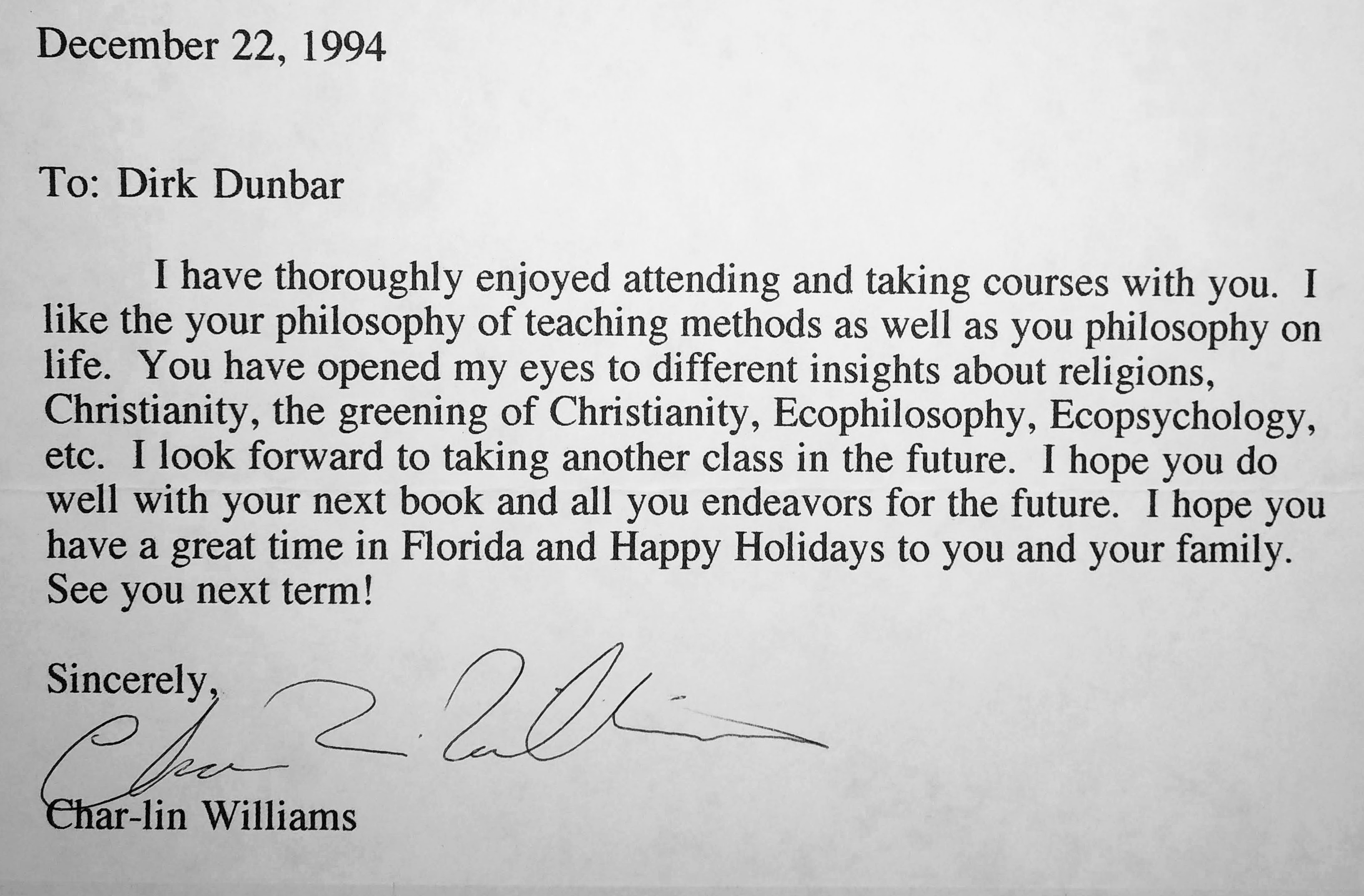 The other two parts of humanities were equally broad but just as much fun to teach. I also taught humanities at Unity College, where the entire history of world civilizations was packed into two parts, and at Northwest Florida State College, where it was all stuffed into one! Anyway, the film class became one of my favorites to teach. Over my career, I had over 90 sections of film, mostly at NWFSC but some at UWF as well as the ones at FSU. I taught over 100 sections of World Religions, and all kinds of other religion courses (see Syllabi below). Having retired in 2021, it’s fun reminiscing about all this. Students help. I recently received an email from a student, Blair, who I taught at FSU over 30 years ago. She was talking to her husband about me because I was the only professor she remembered and looked me up. She saw my articles and books on nature, balance, and spirituality and knew it was me. She thanked me, told me about her education, job, and two teenage sons, and congratulated me on my retirement. Needless to say, she made my day. The classes at FSU were huge, with well over 30 students. I did my best to make them discussion-based but it was difficult so I did quite a bit of lecturing, wrote key terms on the board, and asked specific questions while walking around the class trying to keep up with the material. For the most part, it apparently worked. With help from student evaluations, I won the Sarah Herndon Teaching Award presented annually to a graduate assistant. Here are a few comments from my first two classes: