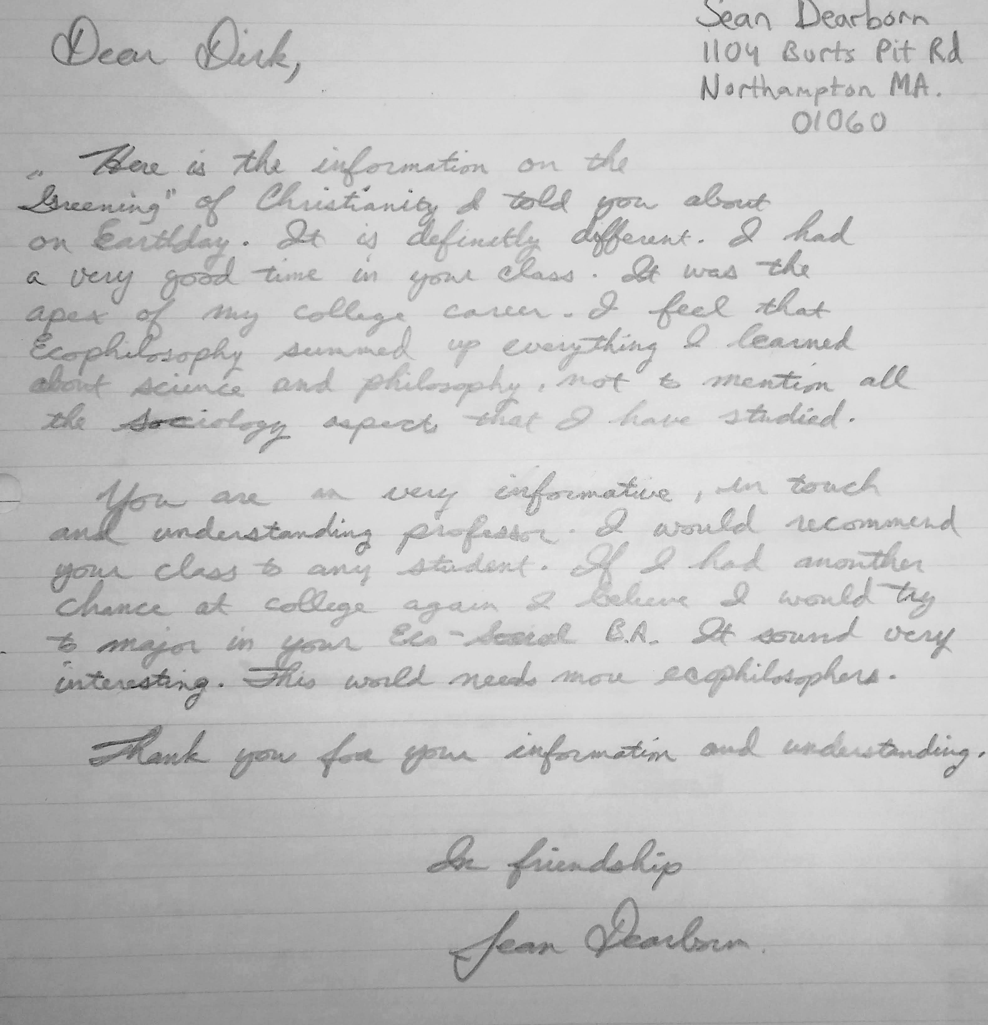 My passion for the place and people at Unity was reciprocated, as my chair, evaluating committee, and student evaluations indicate. As Jim Horan points out, 99.3% of my students at FSU and Unity strongly agree that I am an enthusiastic teacher and am recurrently regarded as “the best teacher I have ever had,” while other comments include “very enlightening,” “one of a handful of instructors that has given me a true challenge… making me want to learn and work harder,” and “This course allowed me to look inside myself and solidify some of my values along with redirecting some others.” Jim adds, “These reactions are also reflected in letters from former students in DIrk’s dossier that indicate that the writers gained lasting value from Dirk’s courses… it is this excitement described above that opens new doors and even new worlds to some students.” Also, “He has developed a following in the student body… and, as a result, Unity College is benefiting from an increased interest among students in philosophy and humanities…”